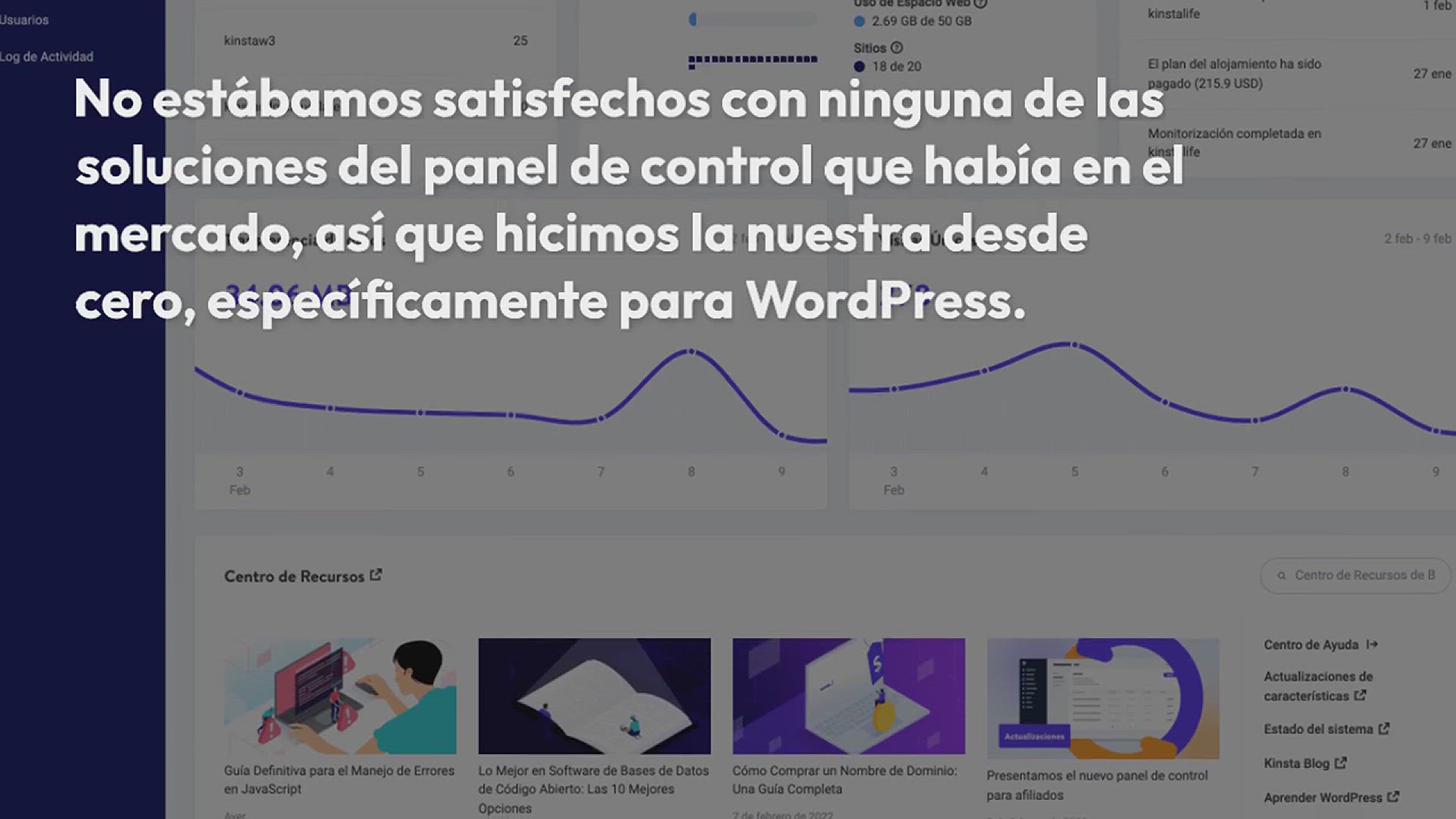 No estábamos satisfechos con ninguna de las soluciones existentes del panel de control que había en el mercado, así que hicimos la nuestra desde cero, específicamente para WordPress. ¡La habilidad de poder administrar múltiples sitios de WordPress nunca había sido tan fácil! Sea que esté estableciendo un SSL en su tienda WooCommerce, viendo sus analytics, o agregando redirecciones 301, MyKinsta hace que esto sea muy sencillo.