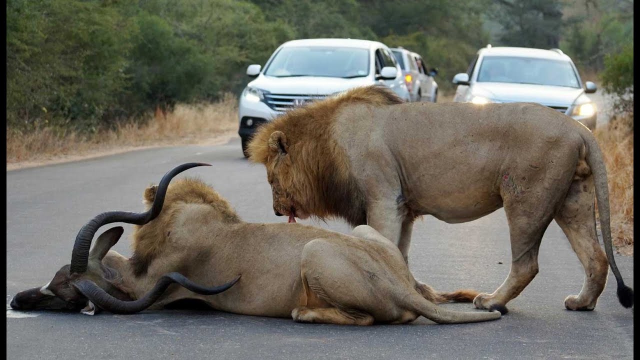 2 Male Lions Kill Kudu in the Middle of the Road - Latest Wildlife Sightings