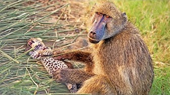 Baboons Steal & Groom 2 Leopard Cubs