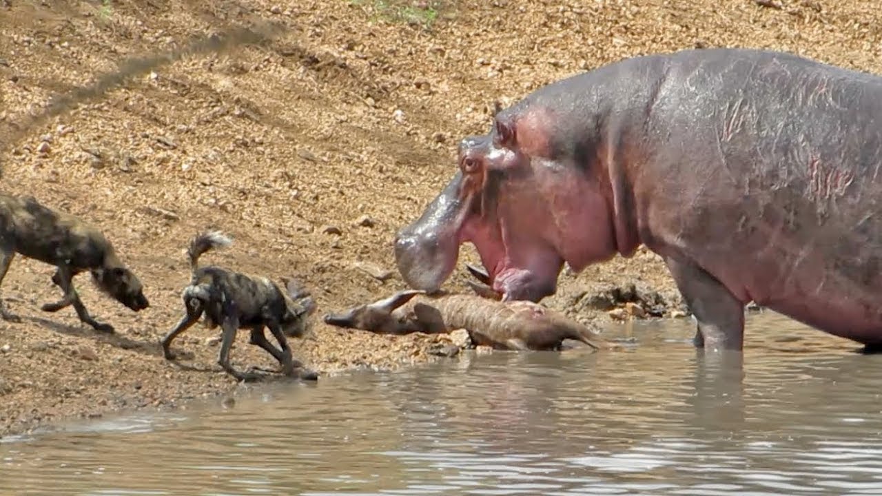 Hippo Steals Kudu from Wild Dogs
