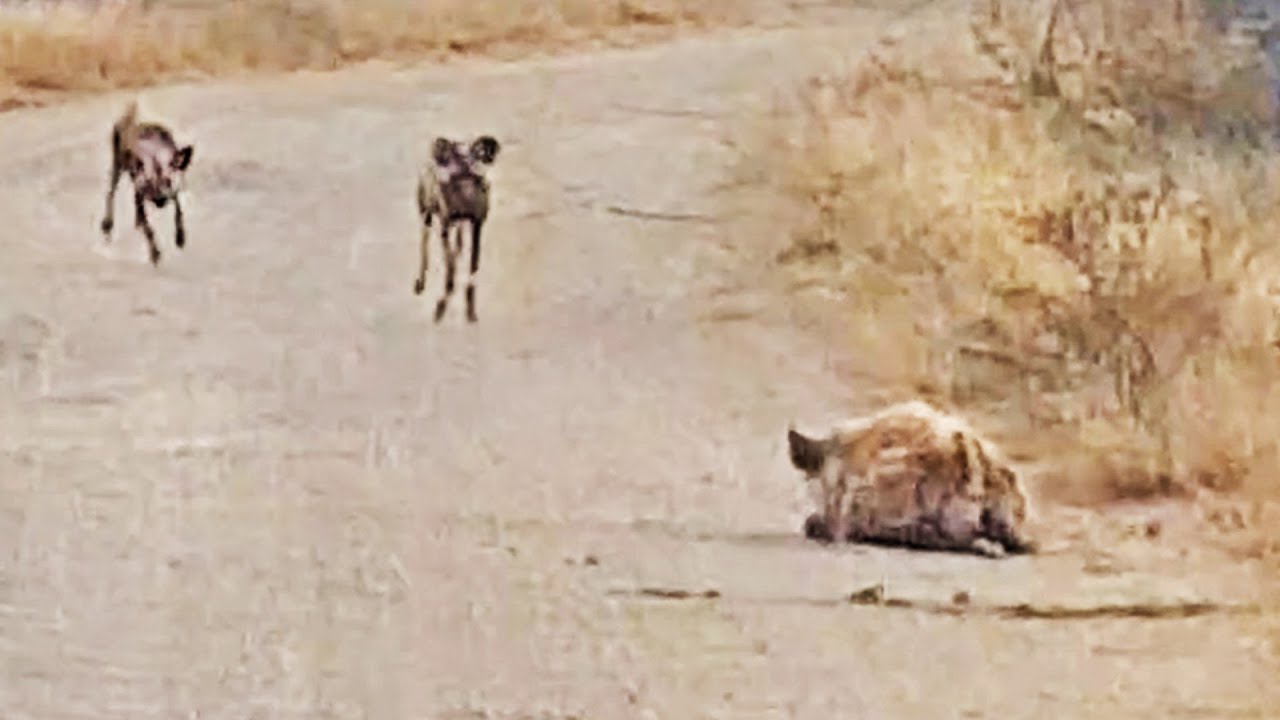 Hyena Tries Hiding from Wild Dogs in Plain Sight