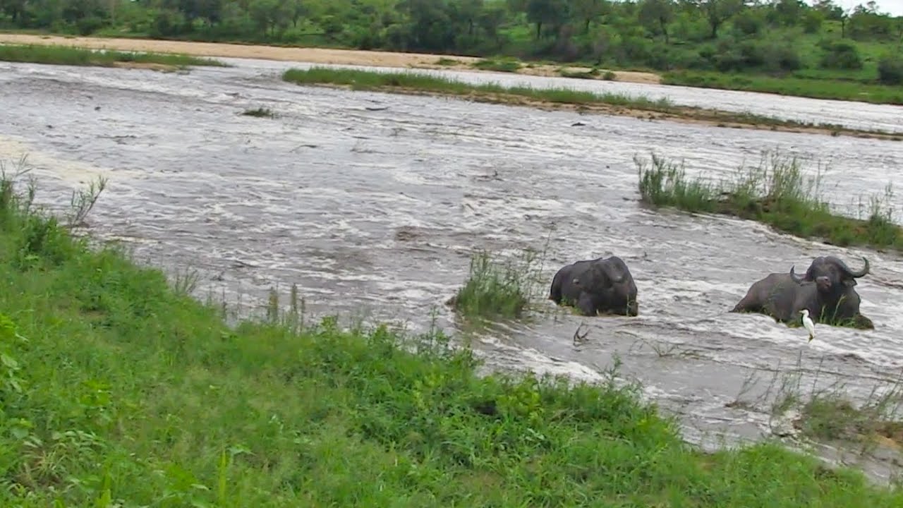 At the moment, there is a flood occurring in the Kruger National Park. Watch the moment 2 buffaloes sleep in a dry riverbed, not knowing the river is about to get flooded!