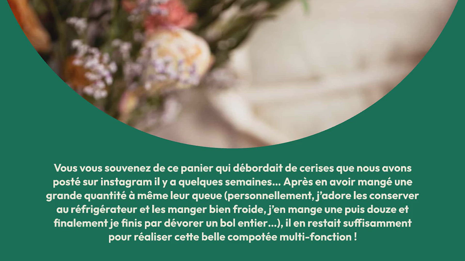 Vous vous souvenez de ce panier qui débordait de cerises que nous avons posté sur instagram il y a quelques semaines… Après en avoir mangé une grande quantité à même leur queue (personnellement, j’adore les conserver au réfrigérateur et les manger bien froide, j’en mange une puis douze et finalement je finis par dévorer un bol entier…), il en restait suffisamment pour réaliser cette belle compotée multi-fonction !