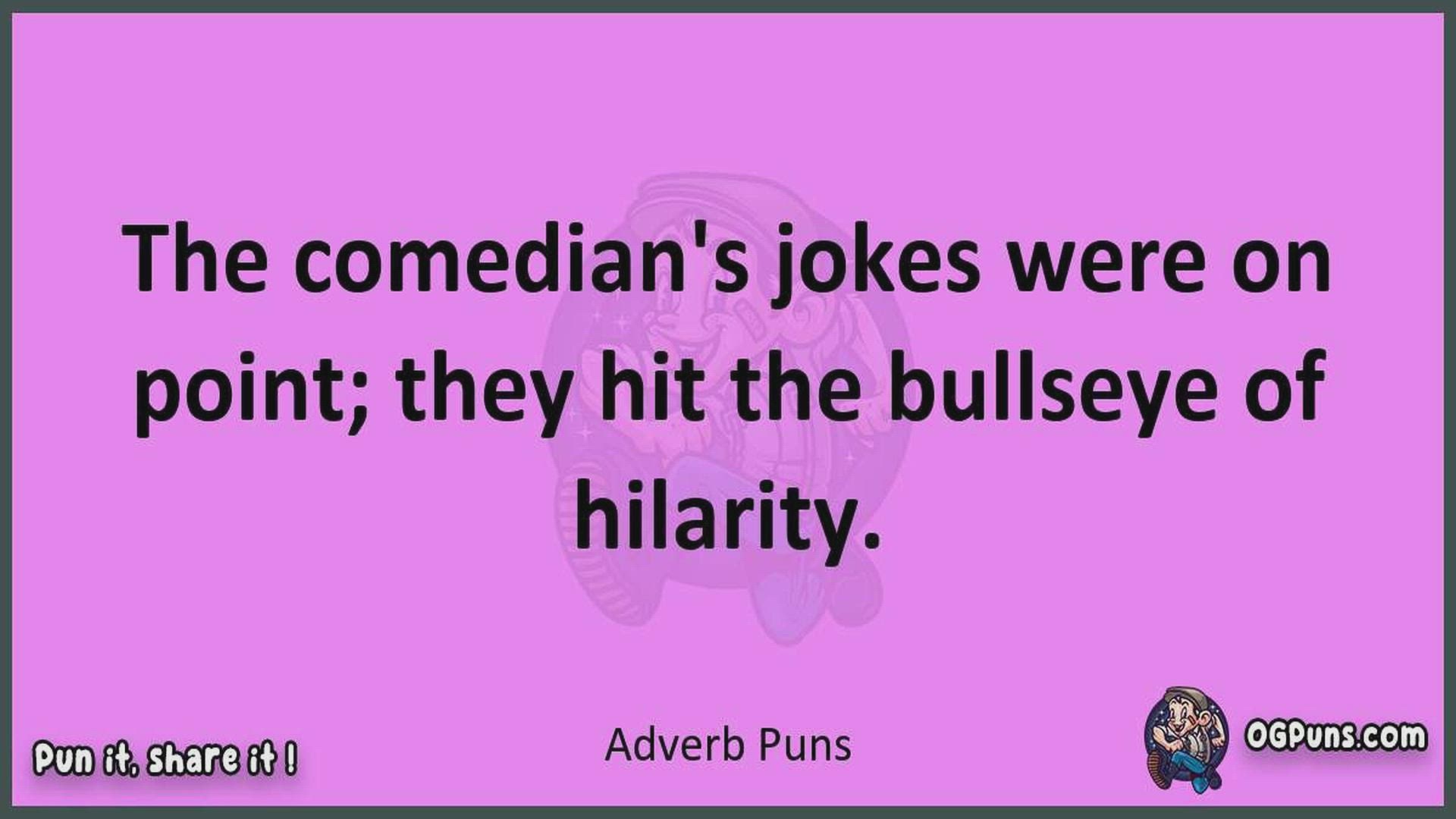 Delve into the delightful world of Adverb Puns ! Here, you'll find an entertaining mix of jokes, puns, quips, and wordplay. Each piece is crafted to offer a quick escape into humor, perfect for a light-hearted moment in any day. Whether you're seeking a chuckle or a clever twist on familiar themes, this collection promises to deliver smiles and laughter. Embrace the lighter side of life with humor that's both witty and refreshing."