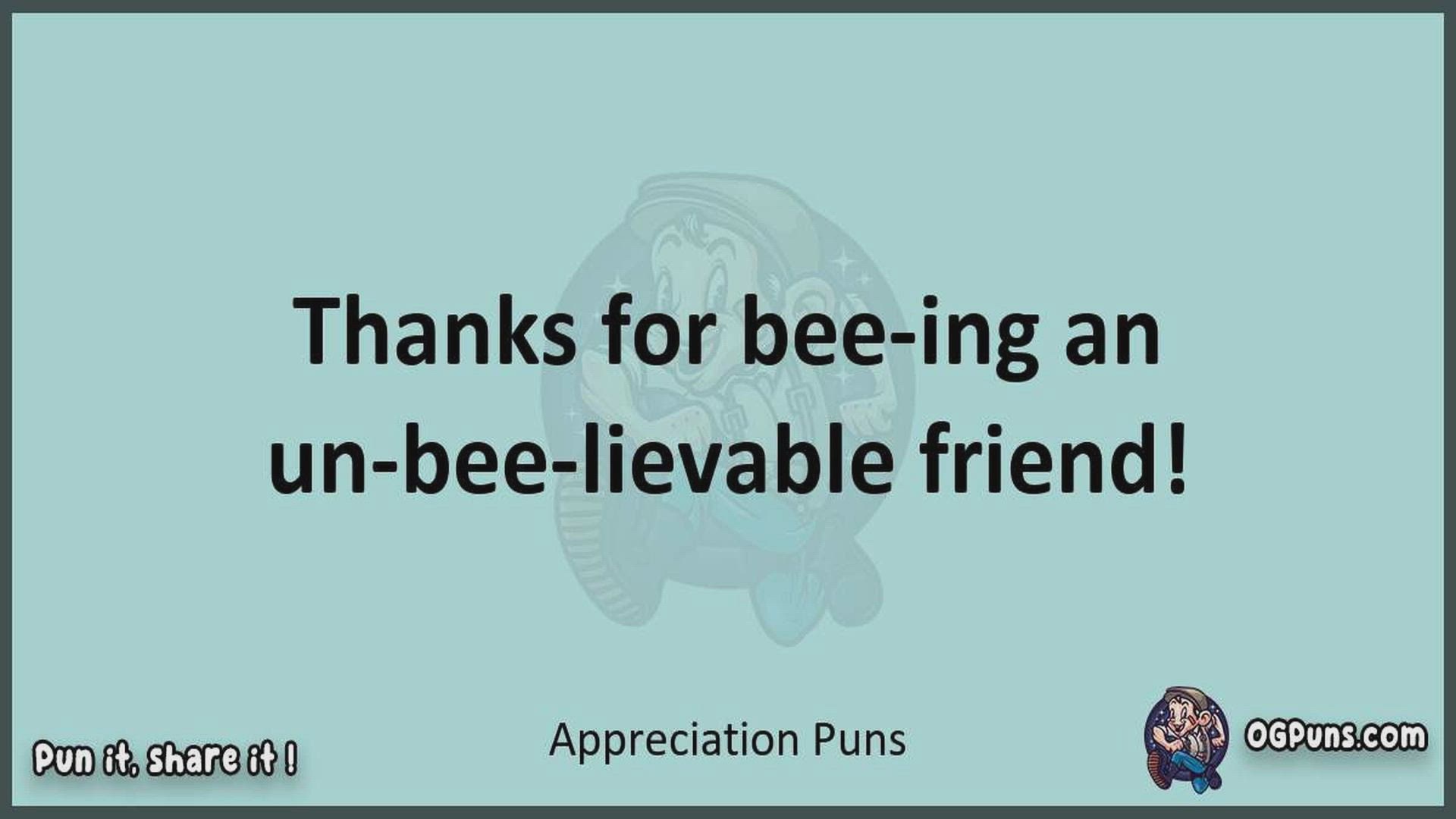 Delve into the delightful world of Appreciation Puns ! Here, you'll find an entertaining mix of jokes, puns, quips, and wordplay. Each piece is crafted to offer a quick escape into humor, perfect for a light-hearted moment in any day. Whether you're seeking a chuckle or a clever twist on familiar themes, this collection promises to deliver smiles and laughter. Embrace the lighter side of life with humor that's both witty and refreshing."