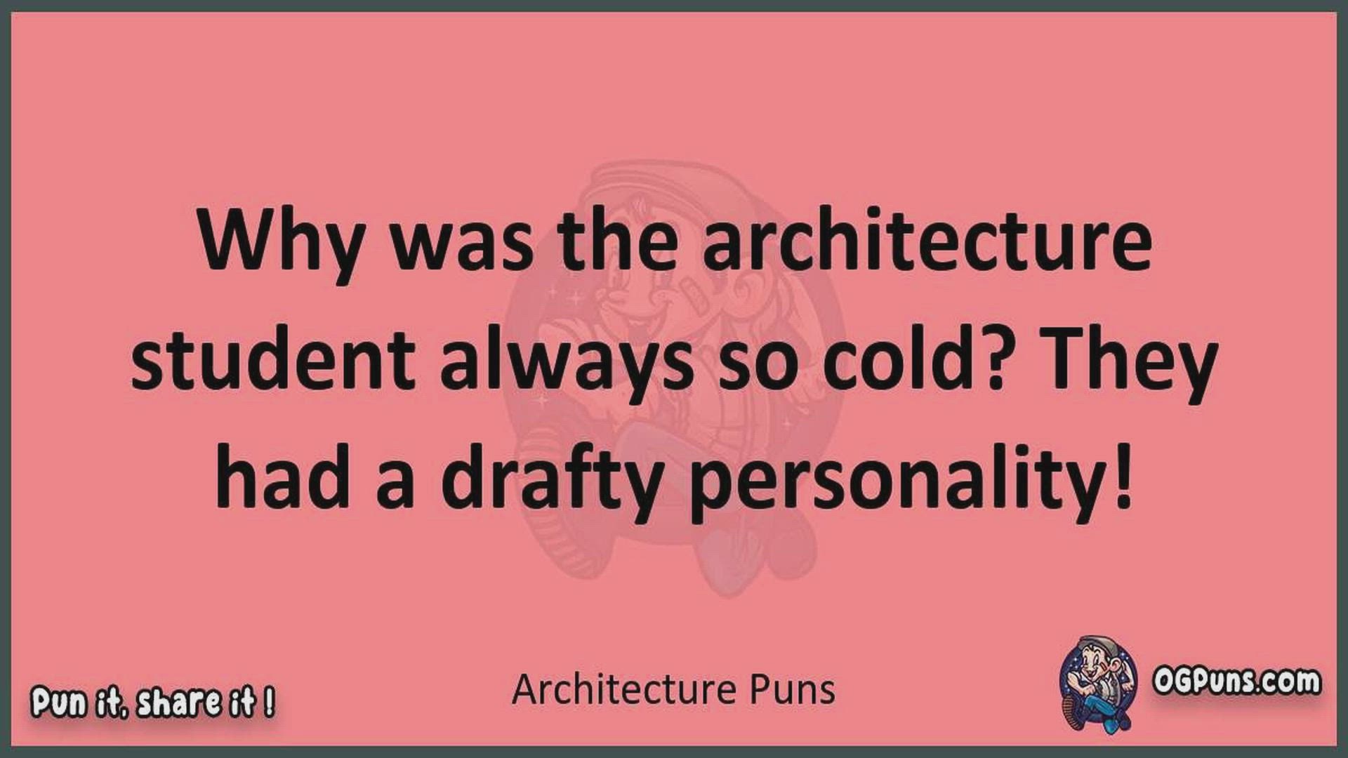 Delve into the delightful world of Architecture Puns ! Here, you'll find an entertaining mix of jokes, puns, quips, and wordplay. Each piece is crafted to offer a quick escape into humor, perfect for a light-hearted moment in any day. Whether you're seeking a chuckle or a clever twist on familiar themes, this collection promises to deliver smiles and laughter. Embrace the lighter side of life with humor that's both witty and refreshing."