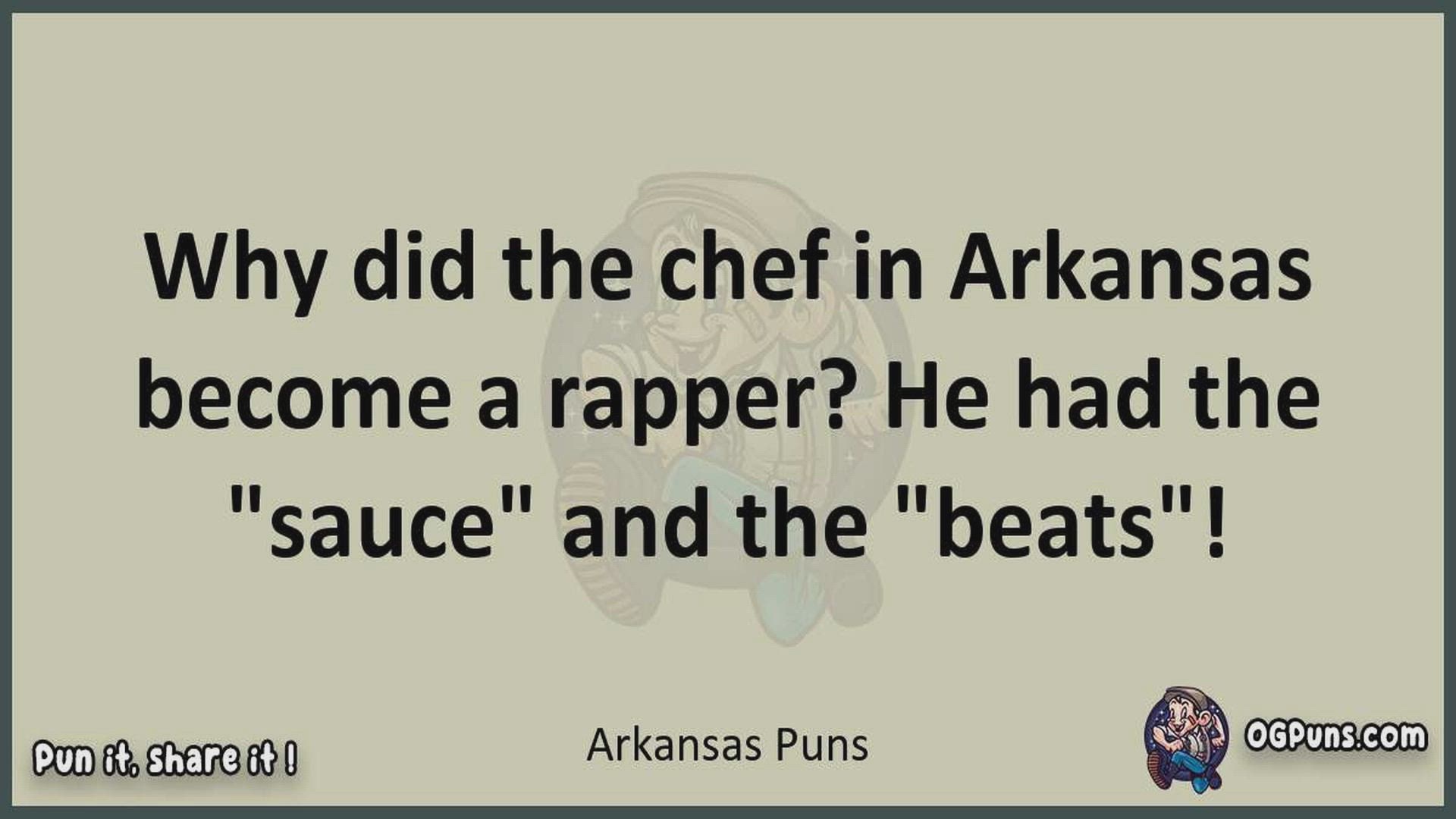 Delve into the delightful world of Arkansas Puns ! Here, you'll find an entertaining mix of jokes, puns, quips, and wordplay. Each piece is crafted to offer a quick escape into humor, perfect for a light-hearted moment in any day. Whether you're seeking a chuckle or a clever twist on familiar themes, this collection promises to deliver smiles and laughter. Embrace the lighter side of life with humor that's both witty and refreshing."