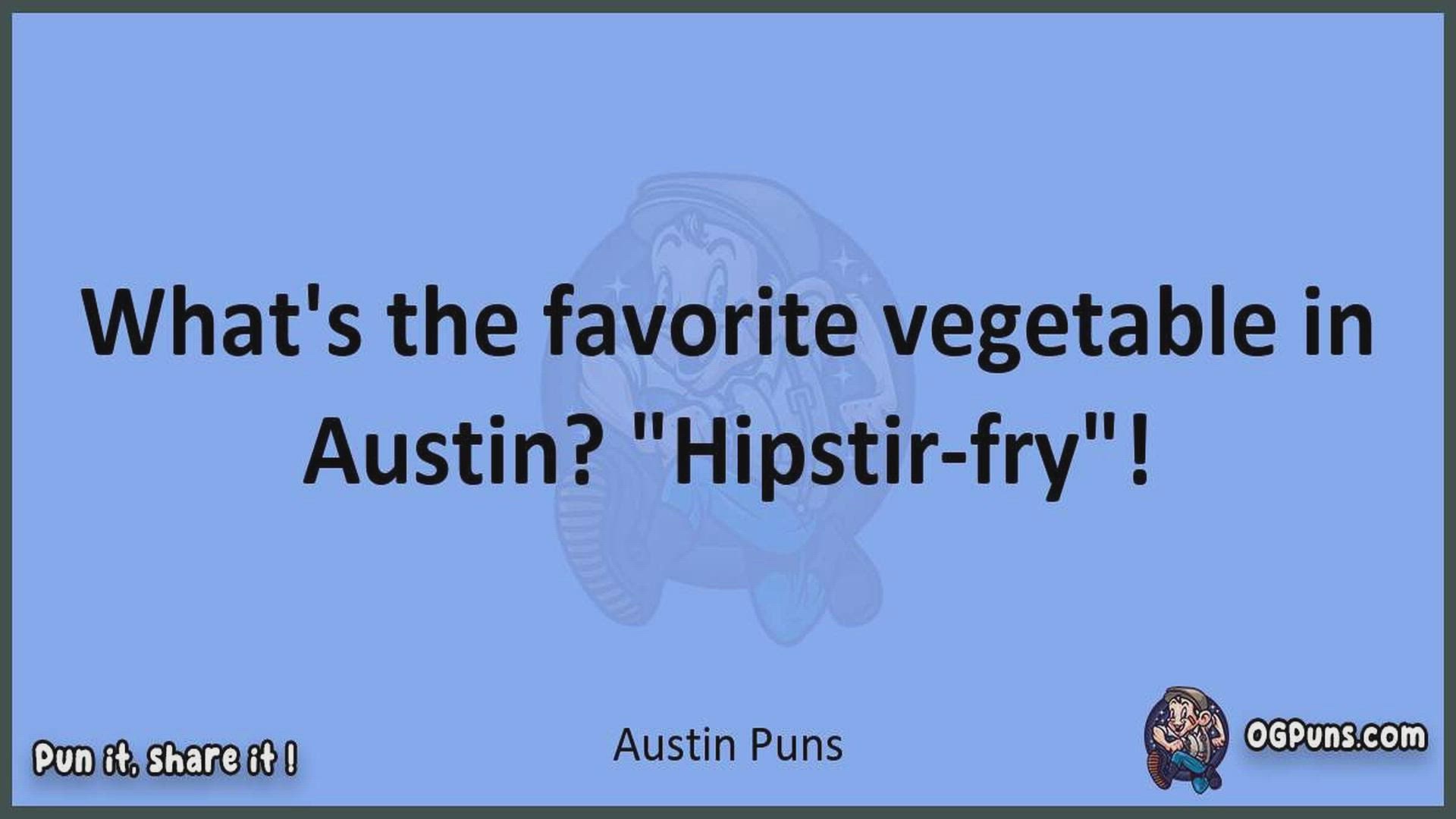 Delve into the delightful world of Austin Puns ! Here, you'll find an entertaining mix of jokes, puns, quips, and wordplay. Each piece is crafted to offer a quick escape into humor, perfect for a light-hearted moment in any day. Whether you're seeking a chuckle or a clever twist on familiar themes, this collection promises to deliver smiles and laughter. Embrace the lighter side of life with humor that's both witty and refreshing."