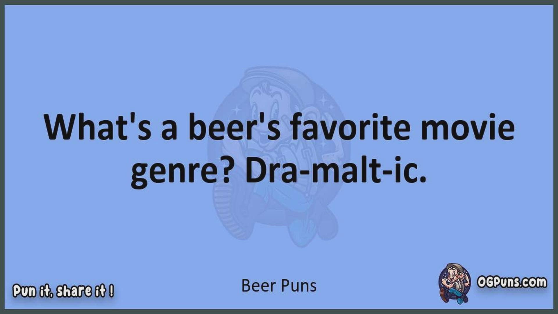 Delve into the delightful world of Beer Puns ! Here, you'll find an entertaining mix of jokes, puns, quips, and wordplay. Each piece is crafted to offer a quick escape into humor, perfect for a light-hearted moment in any day. Whether you're seeking a chuckle or a clever twist on familiar themes, this collection promises to deliver smiles and laughter. Embrace the lighter side of life with humor that's both witty and refreshing."
