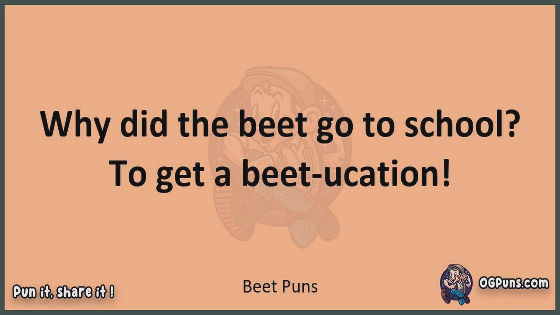 Delve into the delightful world of Beet Puns ! Here, you'll find an entertaining mix of jokes, puns, quips, and wordplay. Each piece is crafted to offer a quick escape into humor, perfect for a light-hearted moment in any day. Whether you're seeking a chuckle or a clever twist on familiar themes, this collection promises to deliver smiles and laughter. Embrace the lighter side of life with humor that's both witty and refreshing."