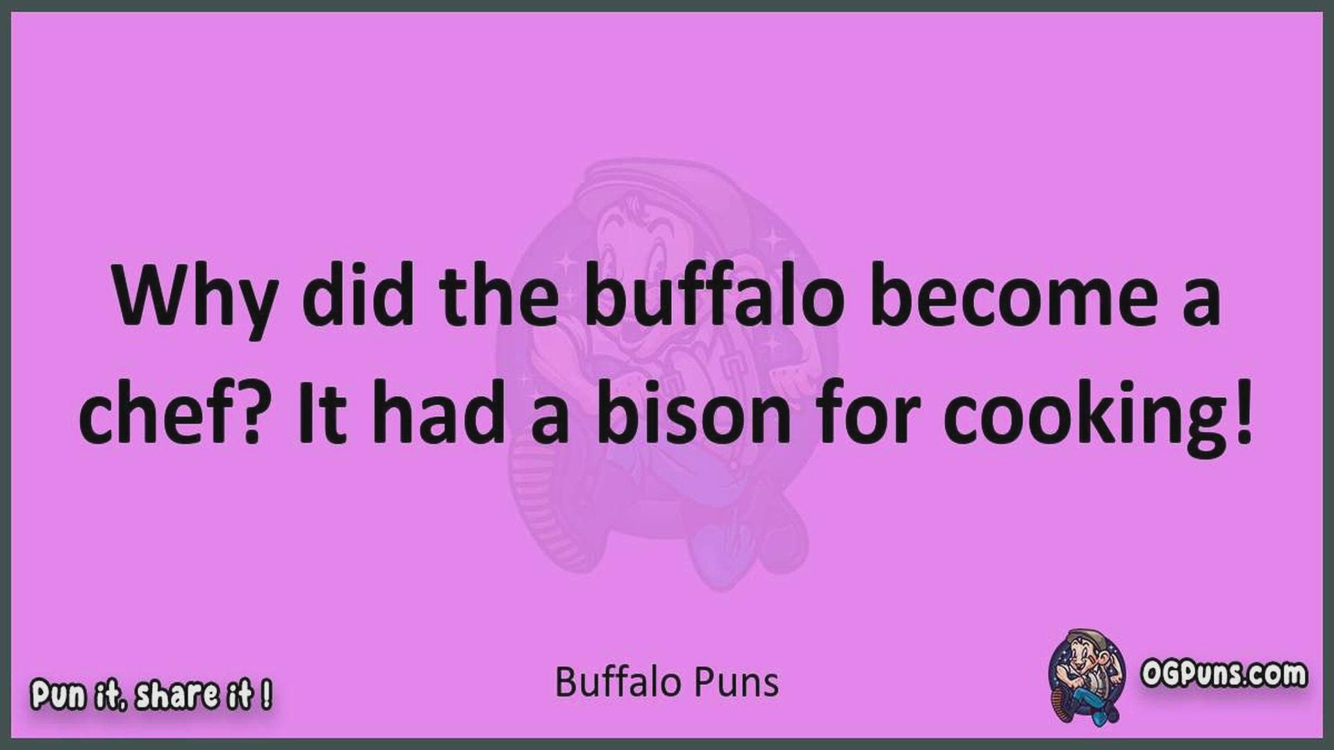 Delve into the delightful world of Buffalo Puns ! Here, you'll find an entertaining mix of jokes, puns, quips, and wordplay. Each piece is crafted to offer a quick escape into humor, perfect for a light-hearted moment in any day. Whether you're seeking a chuckle or a clever twist on familiar themes, this collection promises to deliver smiles and laughter. Embrace the lighter side of life with humor that's both witty and refreshing."
