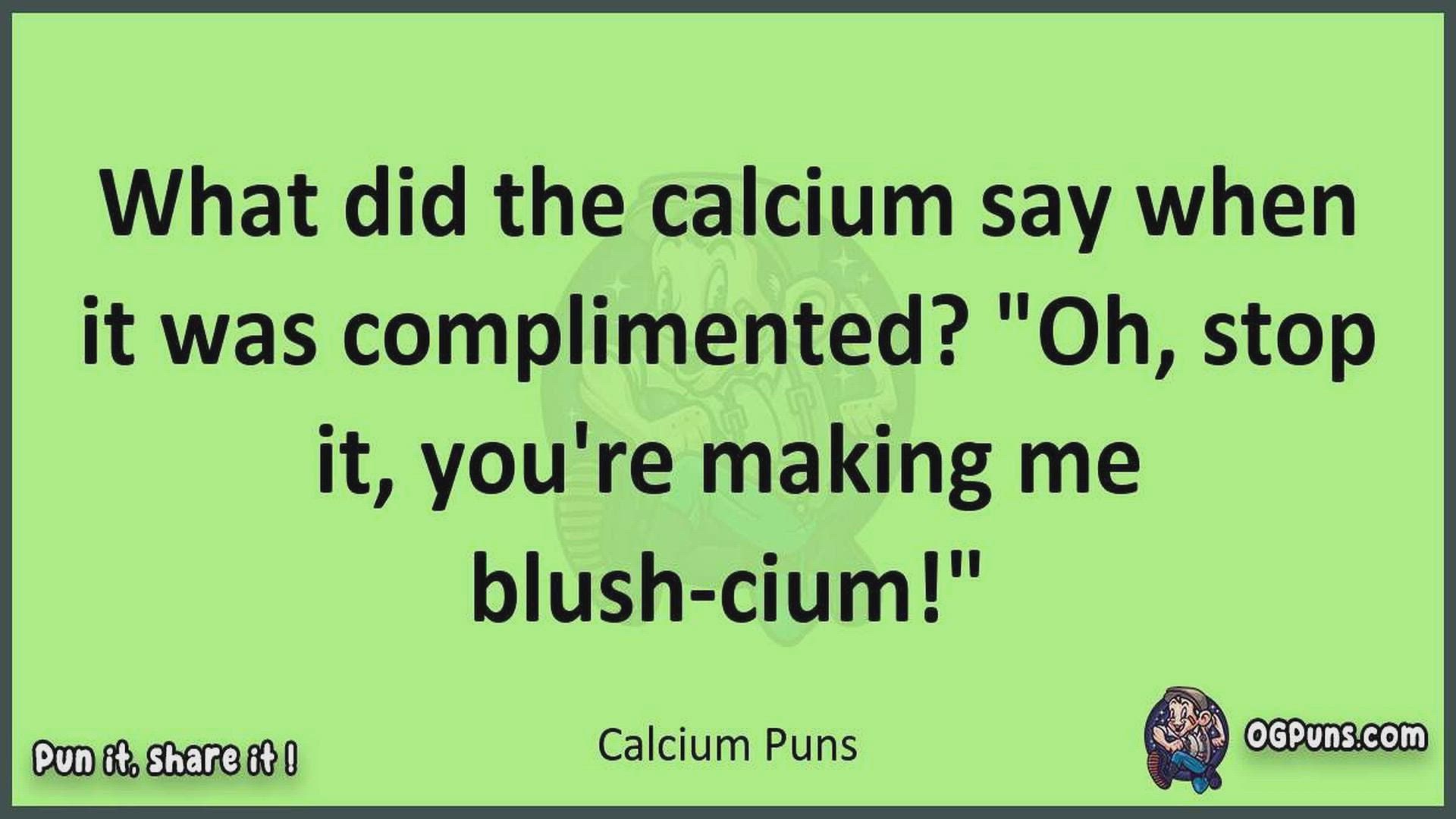 Delve into the delightful world of Calcium Puns ! Here, you'll find an entertaining mix of jokes, puns, quips, and wordplay. Each piece is crafted to offer a quick escape into humor, perfect for a light-hearted moment in any day. Whether you're seeking a chuckle or a clever twist on familiar themes, this collection promises to deliver smiles and laughter. Embrace the lighter side of life with humor that's both witty and refreshing."