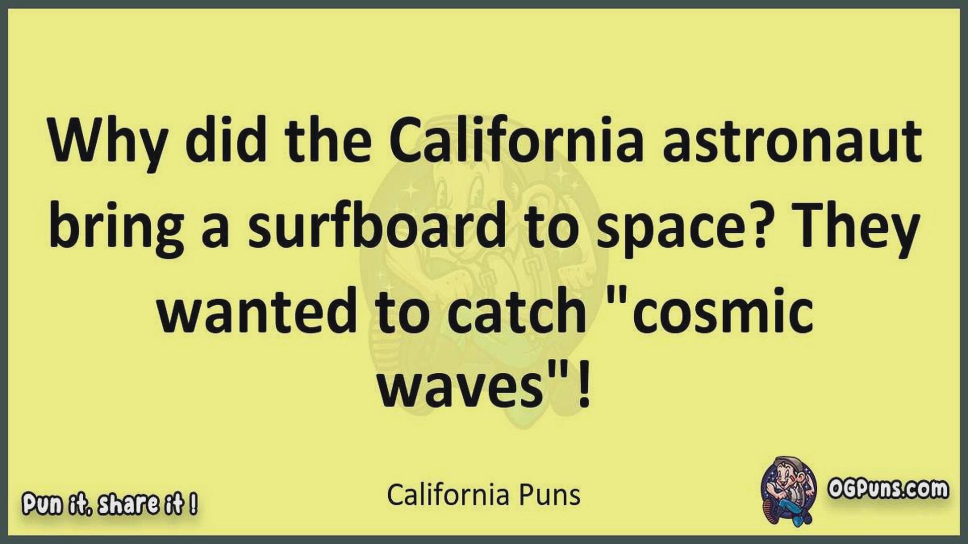 Delve into the delightful world of California Puns ! Here, you'll find an entertaining mix of jokes, puns, quips, and wordplay. Each piece is crafted to offer a quick escape into humor, perfect for a light-hearted moment in any day. Whether you're seeking a chuckle or a clever twist on familiar themes, this collection promises to deliver smiles and laughter. Embrace the lighter side of life with humor that's both witty and refreshing."