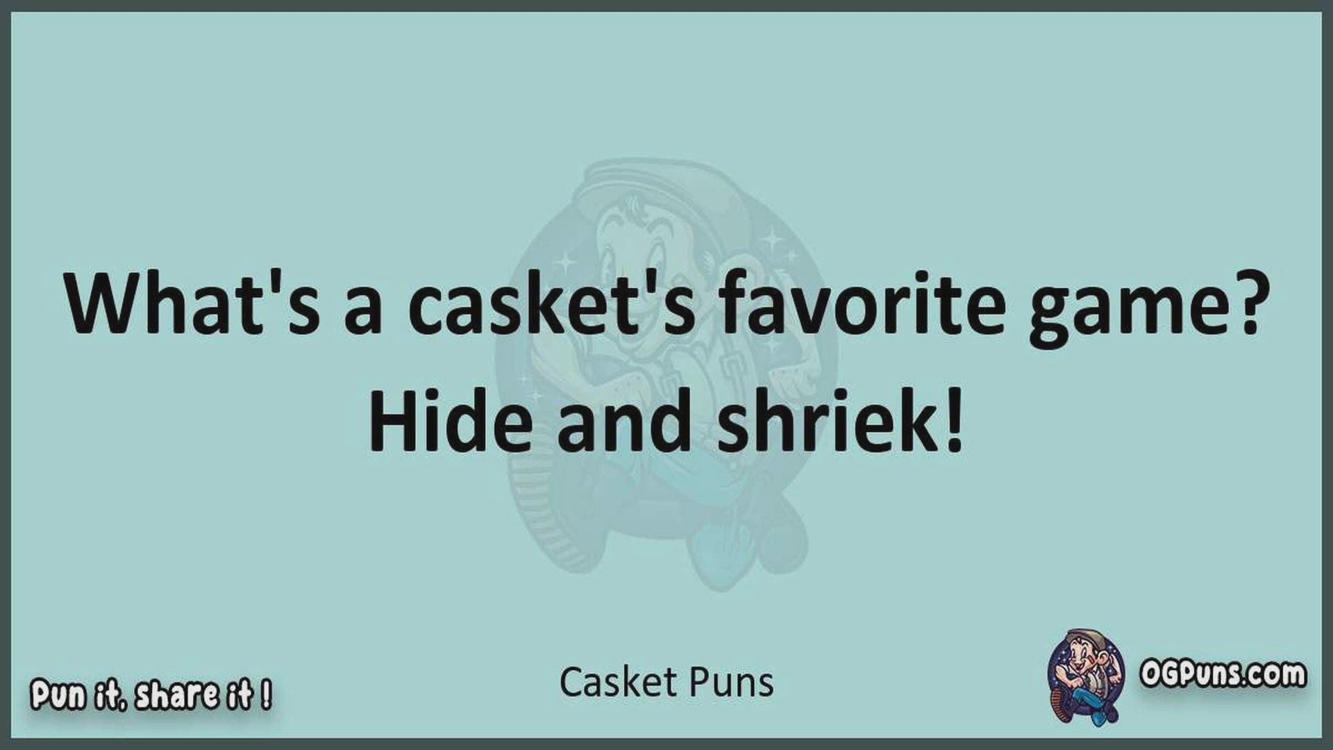 Delve into the delightful world of Casket Puns ! Here, you'll find an entertaining mix of jokes, puns, quips, and wordplay. Each piece is crafted to offer a quick escape into humor, perfect for a light-hearted moment in any day. Whether you're seeking a chuckle or a clever twist on familiar themes, this collection promises to deliver smiles and laughter. Embrace the lighter side of life with humor that's both witty and refreshing."