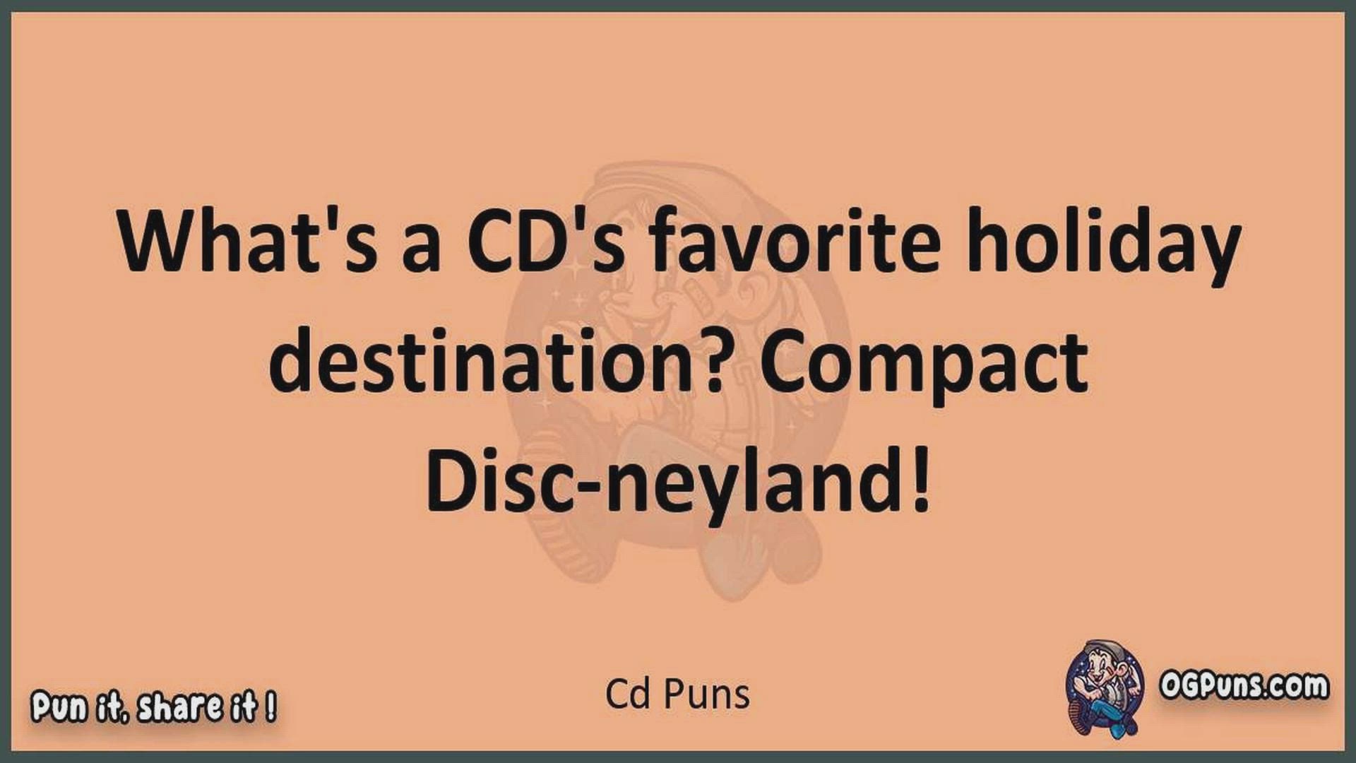 Delve into the delightful world of Cd Puns ! Here, you'll find an entertaining mix of jokes, puns, quips, and wordplay. Each piece is crafted to offer a quick escape into humor, perfect for a light-hearted moment in any day. Whether you're seeking a chuckle or a clever twist on familiar themes, this collection promises to deliver smiles and laughter. Embrace the lighter side of life with humor that's both witty and refreshing."