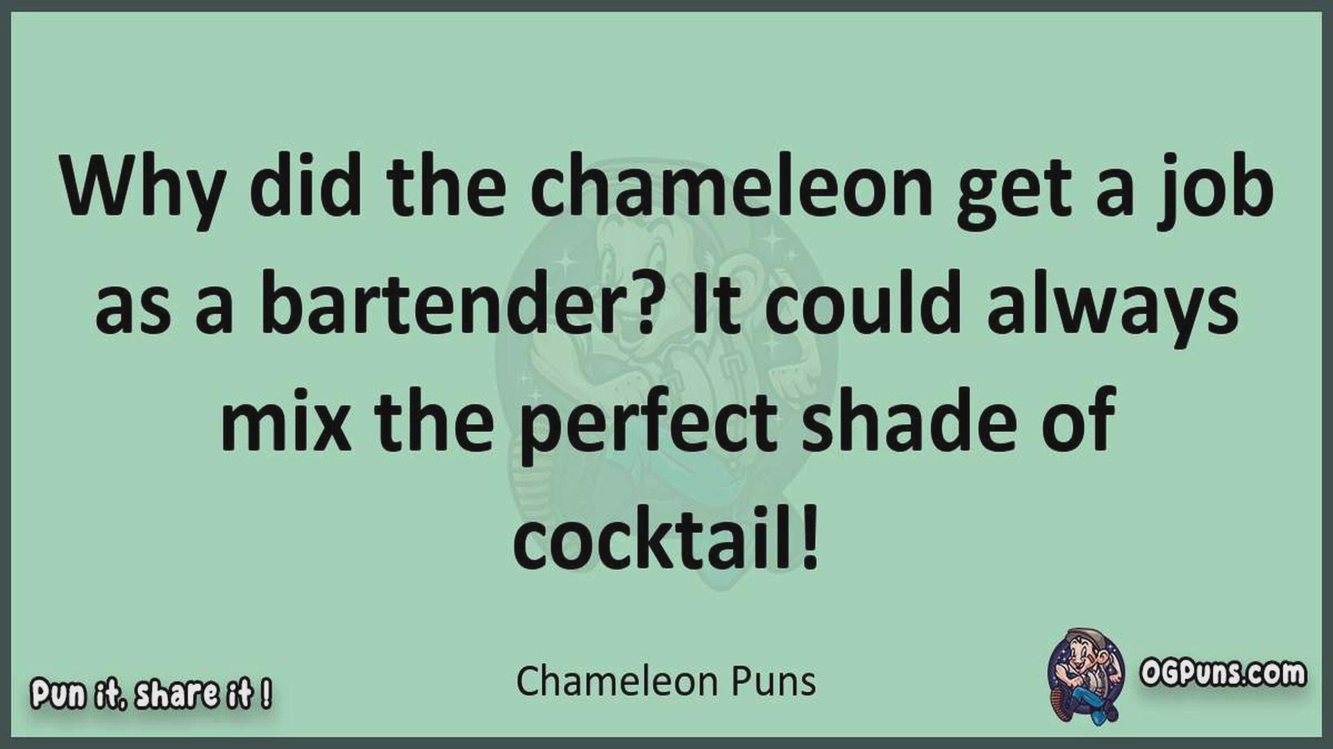 Delve into the delightful world of Chameleon Puns ! Here, you'll find an entertaining mix of jokes, puns, quips, and wordplay. Each piece is crafted to offer a quick escape into humor, perfect for a light-hearted moment in any day. Whether you're seeking a chuckle or a clever twist on familiar themes, this collection promises to deliver smiles and laughter. Embrace the lighter side of life with humor that's both witty and refreshing."