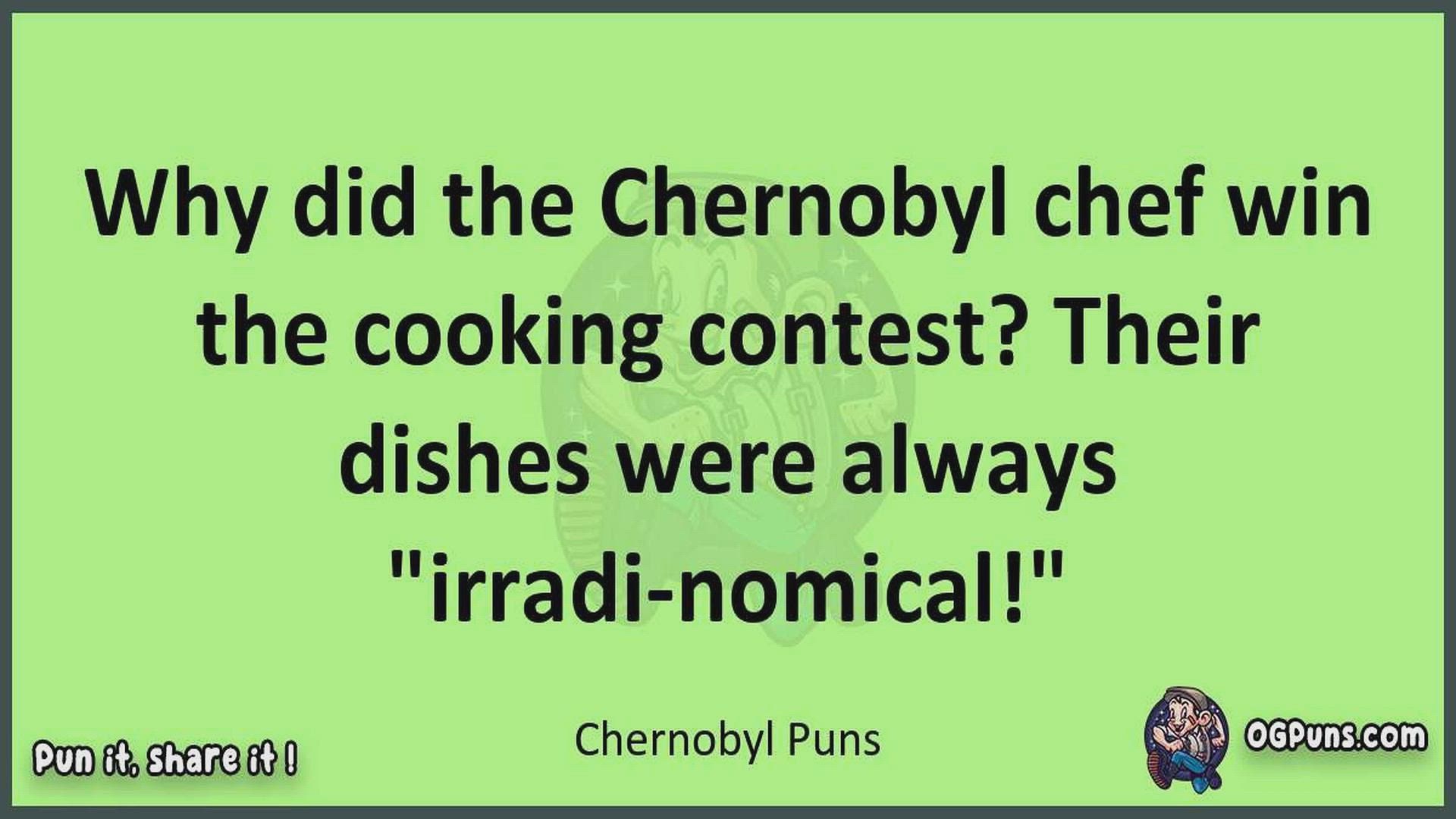 Delve into the delightful world of Chernobyl Puns ! Here, you'll find an entertaining mix of jokes, puns, quips, and wordplay. Each piece is crafted to offer a quick escape into humor, perfect for a light-hearted moment in any day. Whether you're seeking a chuckle or a clever twist on familiar themes, this collection promises to deliver smiles and laughter. Embrace the lighter side of life with humor that's both witty and refreshing."