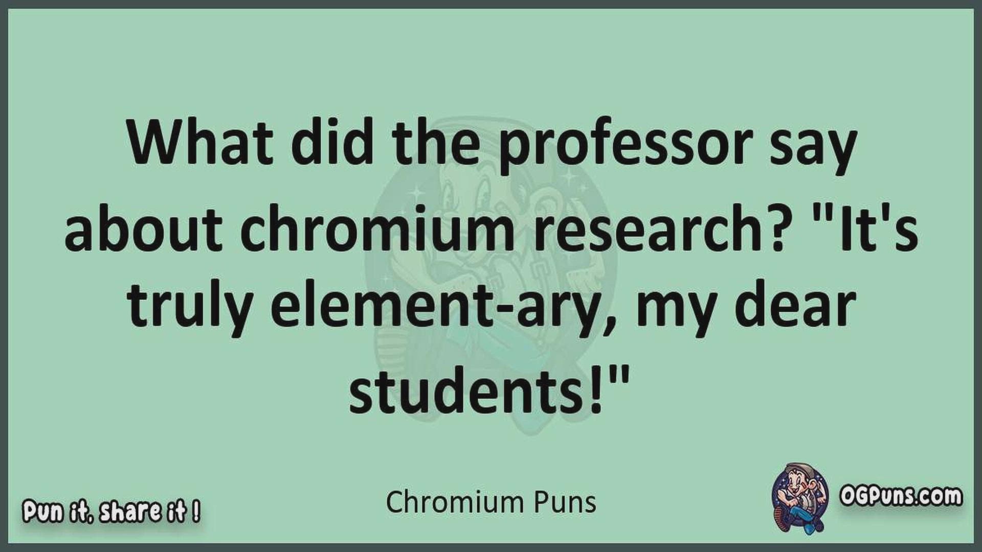 Delve into the delightful world of Chromium Puns ! Here, you'll find an entertaining mix of jokes, puns, quips, and wordplay. Each piece is crafted to offer a quick escape into humor, perfect for a light-hearted moment in any day. Whether you're seeking a chuckle or a clever twist on familiar themes, this collection promises to deliver smiles and laughter. Embrace the lighter side of life with humor that's both witty and refreshing."