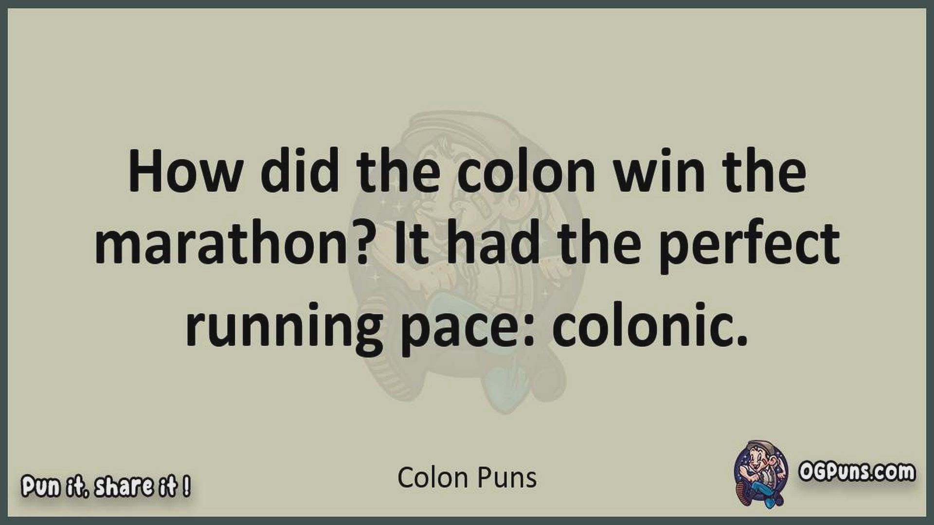 Delve into the delightful world of Colon Puns ! Here, you'll find an entertaining mix of jokes, puns, quips, and wordplay. Each piece is crafted to offer a quick escape into humor, perfect for a light-hearted moment in any day. Whether you're seeking a chuckle or a clever twist on familiar themes, this collection promises to deliver smiles and laughter. Embrace the lighter side of life with humor that's both witty and refreshing."