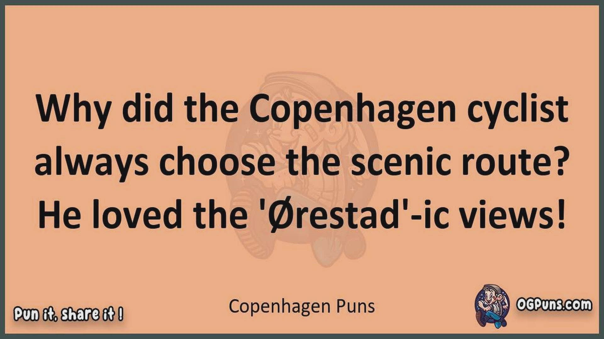 Delve into the delightful world of Copenhagen Puns ! Here, you'll find an entertaining mix of jokes, puns, quips, and wordplay. Each piece is crafted to offer a quick escape into humor, perfect for a light-hearted moment in any day. Whether you're seeking a chuckle or a clever twist on familiar themes, this collection promises to deliver smiles and laughter. Embrace the lighter side of life with humor that's both witty and refreshing."