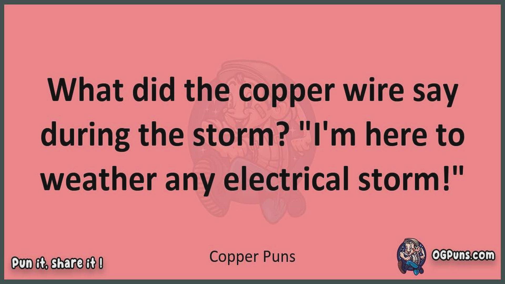 Delve into the delightful world of Copper Puns ! Here, you'll find an entertaining mix of jokes, puns, quips, and wordplay. Each piece is crafted to offer a quick escape into humor, perfect for a light-hearted moment in any day. Whether you're seeking a chuckle or a clever twist on familiar themes, this collection promises to deliver smiles and laughter. Embrace the lighter side of life with humor that's both witty and refreshing."