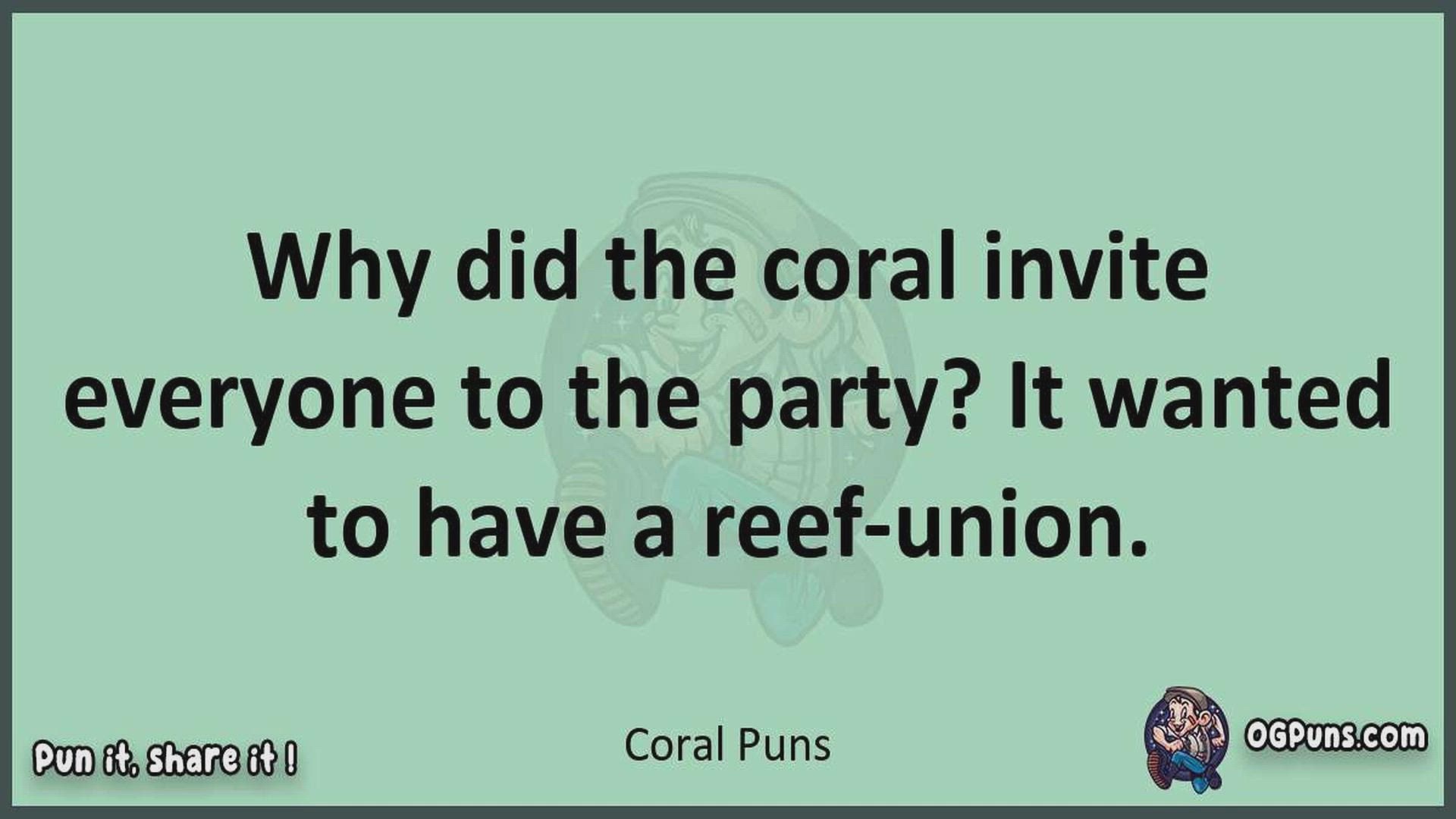 Delve into the delightful world of Coral Puns ! Here, you'll find an entertaining mix of jokes, puns, quips, and wordplay. Each piece is crafted to offer a quick escape into humor, perfect for a light-hearted moment in any day. Whether you're seeking a chuckle or a clever twist on familiar themes, this collection promises to deliver smiles and laughter. Embrace the lighter side of life with humor that's both witty and refreshing."