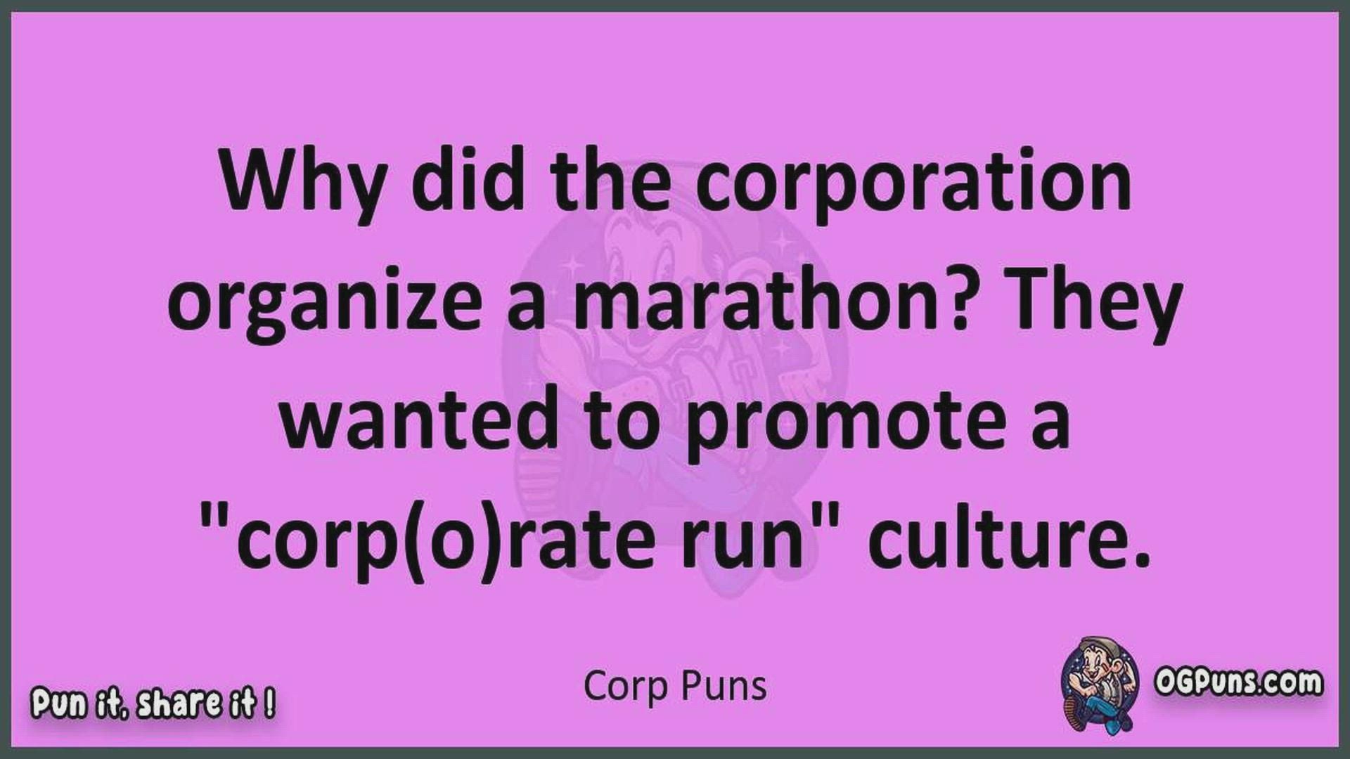 Delve into the delightful world of Corp Puns ! Here, you'll find an entertaining mix of jokes, puns, quips, and wordplay. Each piece is crafted to offer a quick escape into humor, perfect for a light-hearted moment in any day. Whether you're seeking a chuckle or a clever twist on familiar themes, this collection promises to deliver smiles and laughter. Embrace the lighter side of life with humor that's both witty and refreshing."