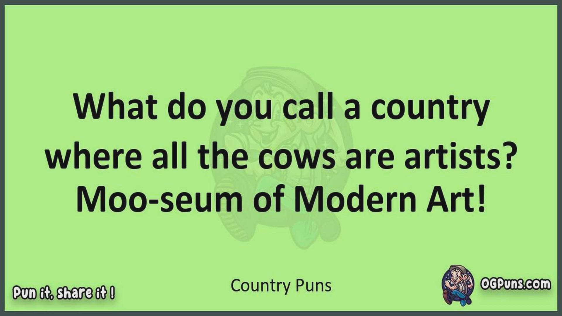 Delve into the delightful world of Country Puns ! Here, you'll find an entertaining mix of jokes, puns, quips, and wordplay. Each piece is crafted to offer a quick escape into humor, perfect for a light-hearted moment in any day. Whether you're seeking a chuckle or a clever twist on familiar themes, this collection promises to deliver smiles and laughter. Embrace the lighter side of life with humor that's both witty and refreshing."
