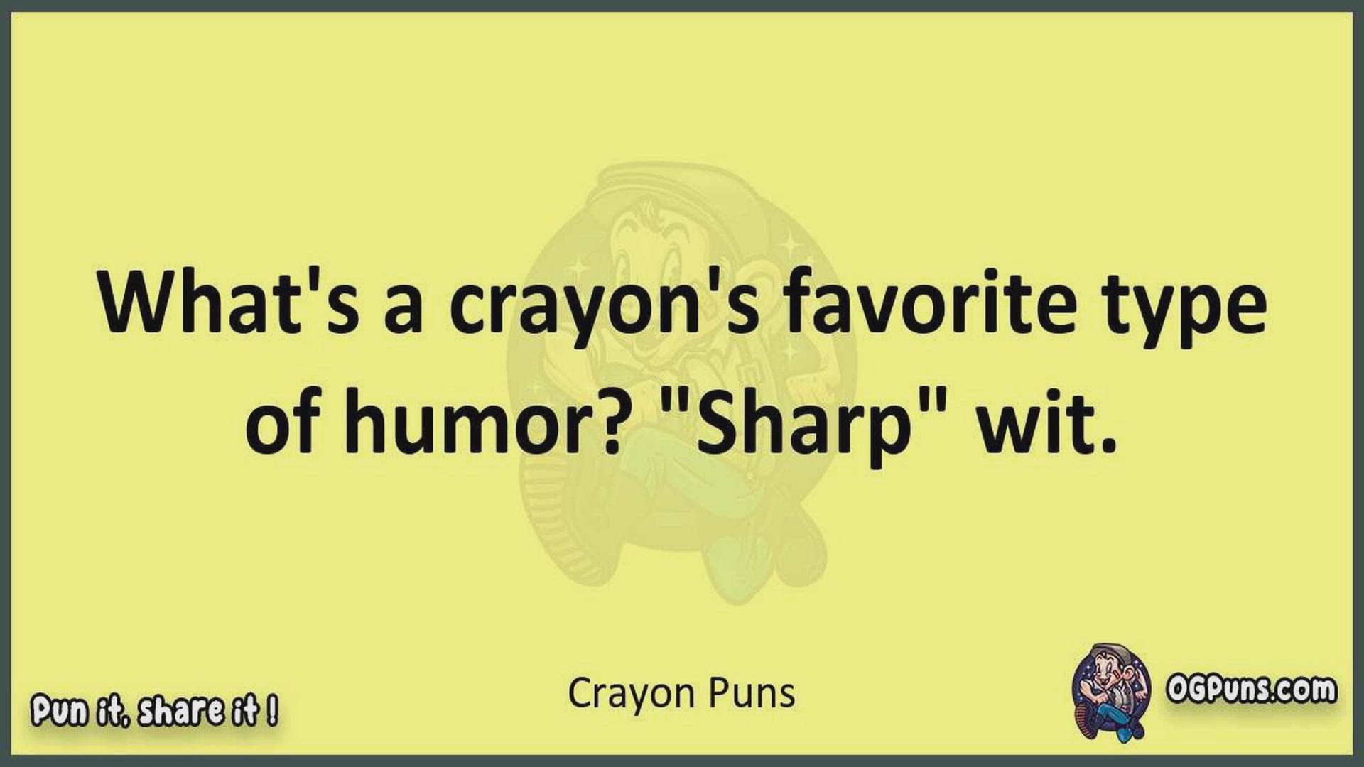 Delve into the delightful world of Crayon Puns ! Here, you'll find an entertaining mix of jokes, puns, quips, and wordplay. Each piece is crafted to offer a quick escape into humor, perfect for a light-hearted moment in any day. Whether you're seeking a chuckle or a clever twist on familiar themes, this collection promises to deliver smiles and laughter. Embrace the lighter side of life with humor that's both witty and refreshing."