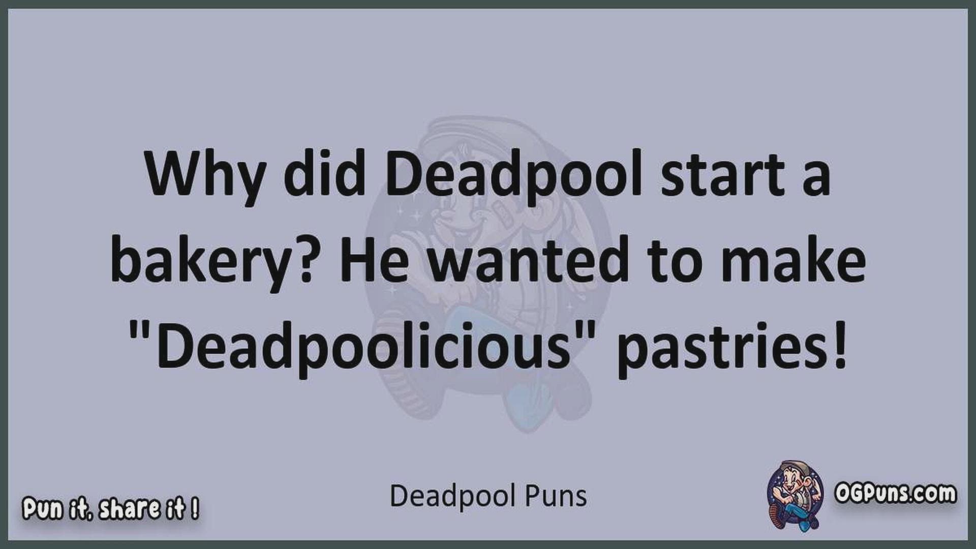 Delve into the delightful world of Deadpool Puns ! Here, you'll find an entertaining mix of jokes, puns, quips, and wordplay. Each piece is crafted to offer a quick escape into humor, perfect for a light-hearted moment in any day. Whether you're seeking a chuckle or a clever twist on familiar themes, this collection promises to deliver smiles and laughter. Embrace the lighter side of life with humor that's both witty and refreshing."