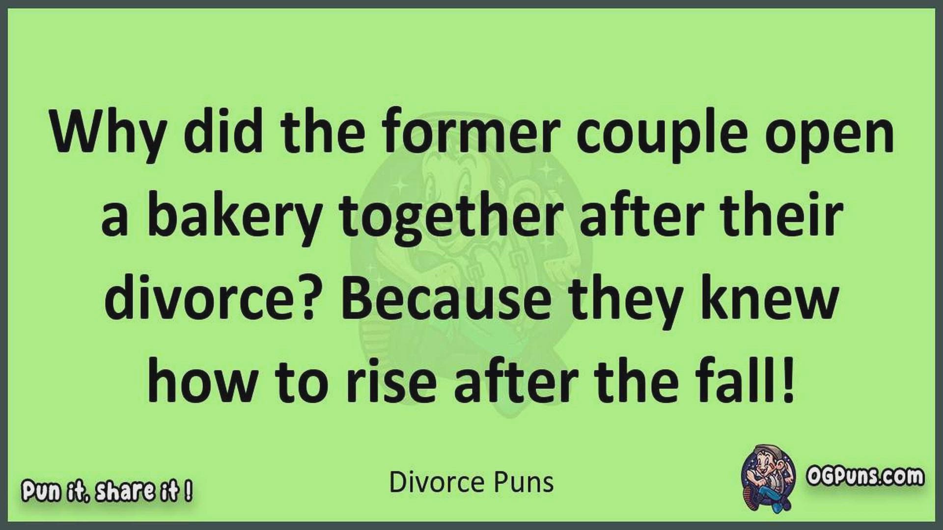 Delve into the delightful world of Divorce Puns ! Here, you'll find an entertaining mix of jokes, puns, quips, and wordplay. Each piece is crafted to offer a quick escape into humor, perfect for a light-hearted moment in any day. Whether you're seeking a chuckle or a clever twist on familiar themes, this collection promises to deliver smiles and laughter. Embrace the lighter side of life with humor that's both witty and refreshing."