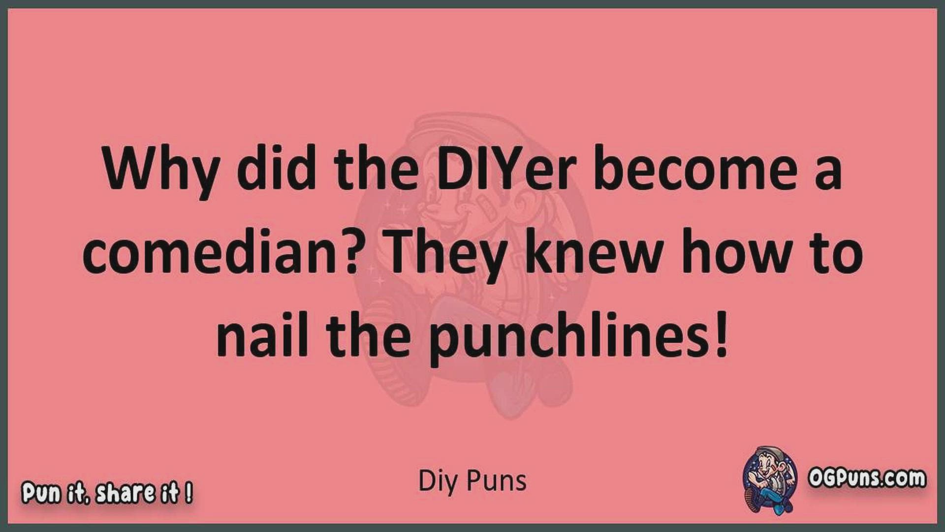 Delve into the delightful world of Diy Puns ! Here, you'll find an entertaining mix of jokes, puns, quips, and wordplay. Each piece is crafted to offer a quick escape into humor, perfect for a light-hearted moment in any day. Whether you're seeking a chuckle or a clever twist on familiar themes, this collection promises to deliver smiles and laughter. Embrace the lighter side of life with humor that's both witty and refreshing."