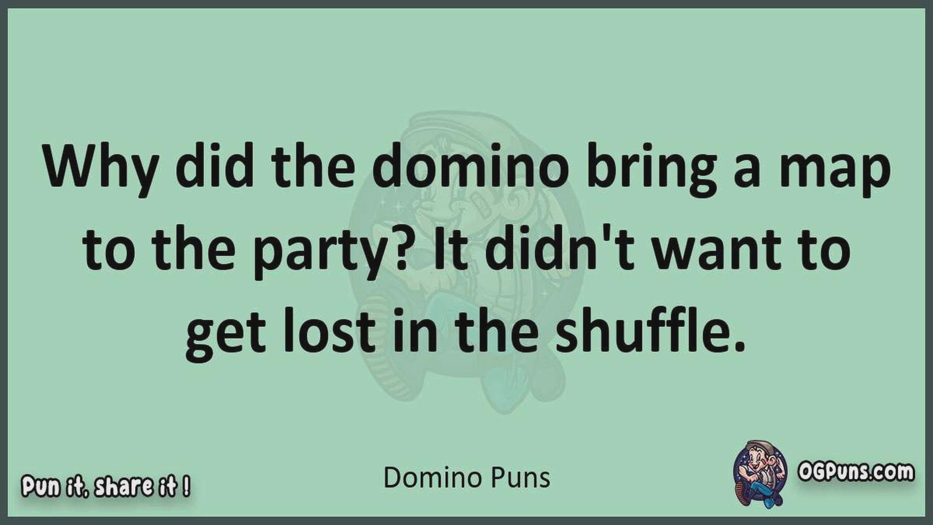 Delve into the delightful world of Domino Puns ! Here, you'll find an entertaining mix of jokes, puns, quips, and wordplay. Each piece is crafted to offer a quick escape into humor, perfect for a light-hearted moment in any day. Whether you're seeking a chuckle or a clever twist on familiar themes, this collection promises to deliver smiles and laughter. Embrace the lighter side of life with humor that's both witty and refreshing."