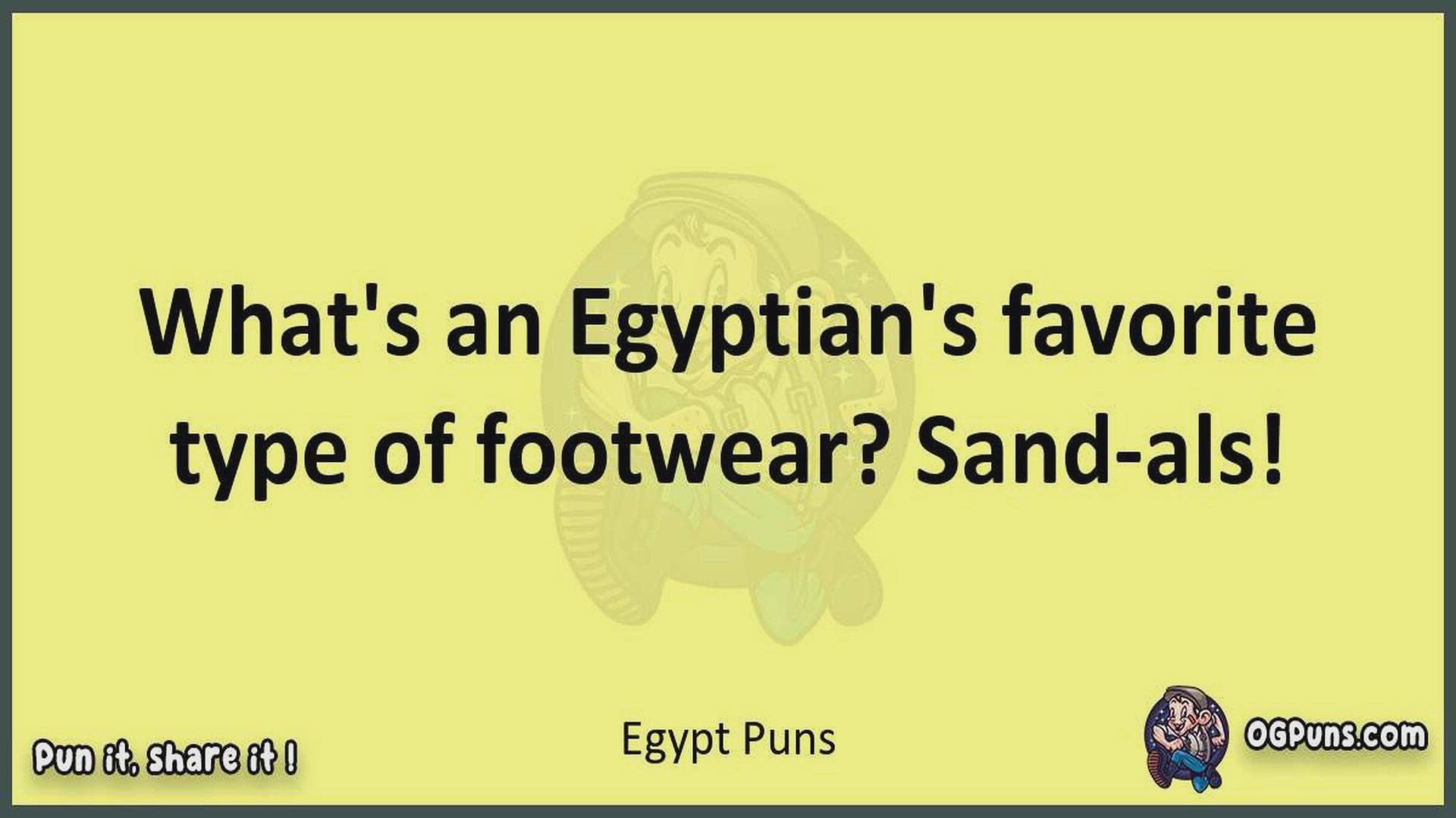 Delve into the delightful world of Egypt Puns ! Here, you'll find an entertaining mix of jokes, puns, quips, and wordplay. Each piece is crafted to offer a quick escape into humor, perfect for a light-hearted moment in any day. Whether you're seeking a chuckle or a clever twist on familiar themes, this collection promises to deliver smiles and laughter. Embrace the lighter side of life with humor that's both witty and refreshing."