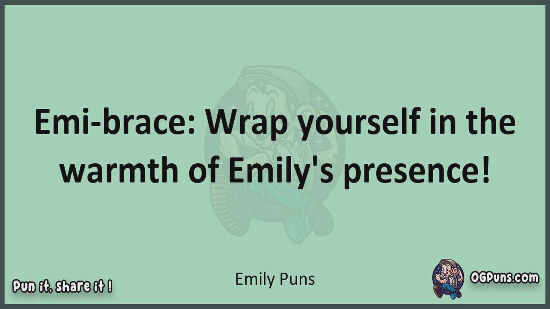 Delve into the delightful world of Emily Puns ! Here, you'll find an entertaining mix of jokes, puns, quips, and wordplay. Each piece is crafted to offer a quick escape into humor, perfect for a light-hearted moment in any day. Whether you're seeking a chuckle or a clever twist on familiar themes, this collection promises to deliver smiles and laughter. Embrace the lighter side of life with humor that's both witty and refreshing."
