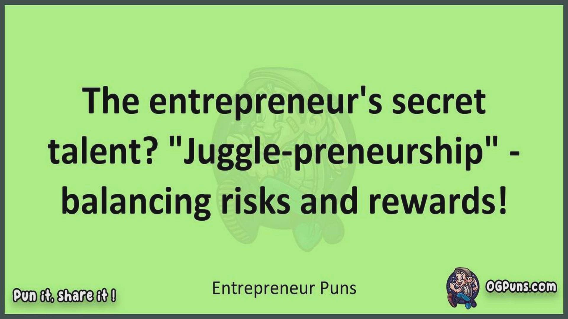 Delve into the delightful world of Entrepreneur Puns ! Here, you'll find an entertaining mix of jokes, puns, quips, and wordplay. Each piece is crafted to offer a quick escape into humor, perfect for a light-hearted moment in any day. Whether you're seeking a chuckle or a clever twist on familiar themes, this collection promises to deliver smiles and laughter. Embrace the lighter side of life with humor that's both witty and refreshing."