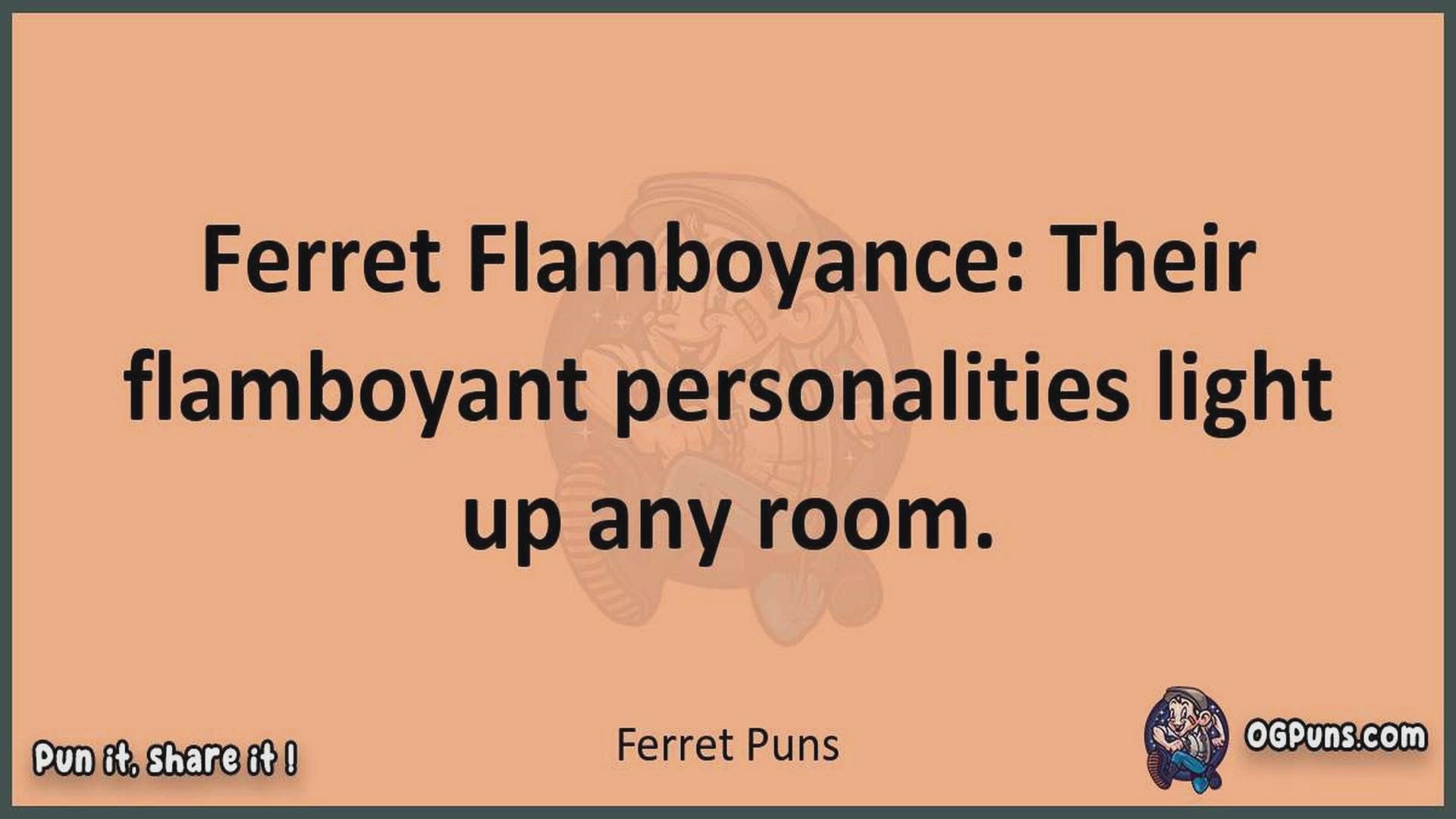 Delve into the delightful world of Ferret Puns ! Here, you'll find an entertaining mix of jokes, puns, quips, and wordplay. Each piece is crafted to offer a quick escape into humor, perfect for a light-hearted moment in any day. Whether you're seeking a chuckle or a clever twist on familiar themes, this collection promises to deliver smiles and laughter. Embrace the lighter side of life with humor that's both witty and refreshing."