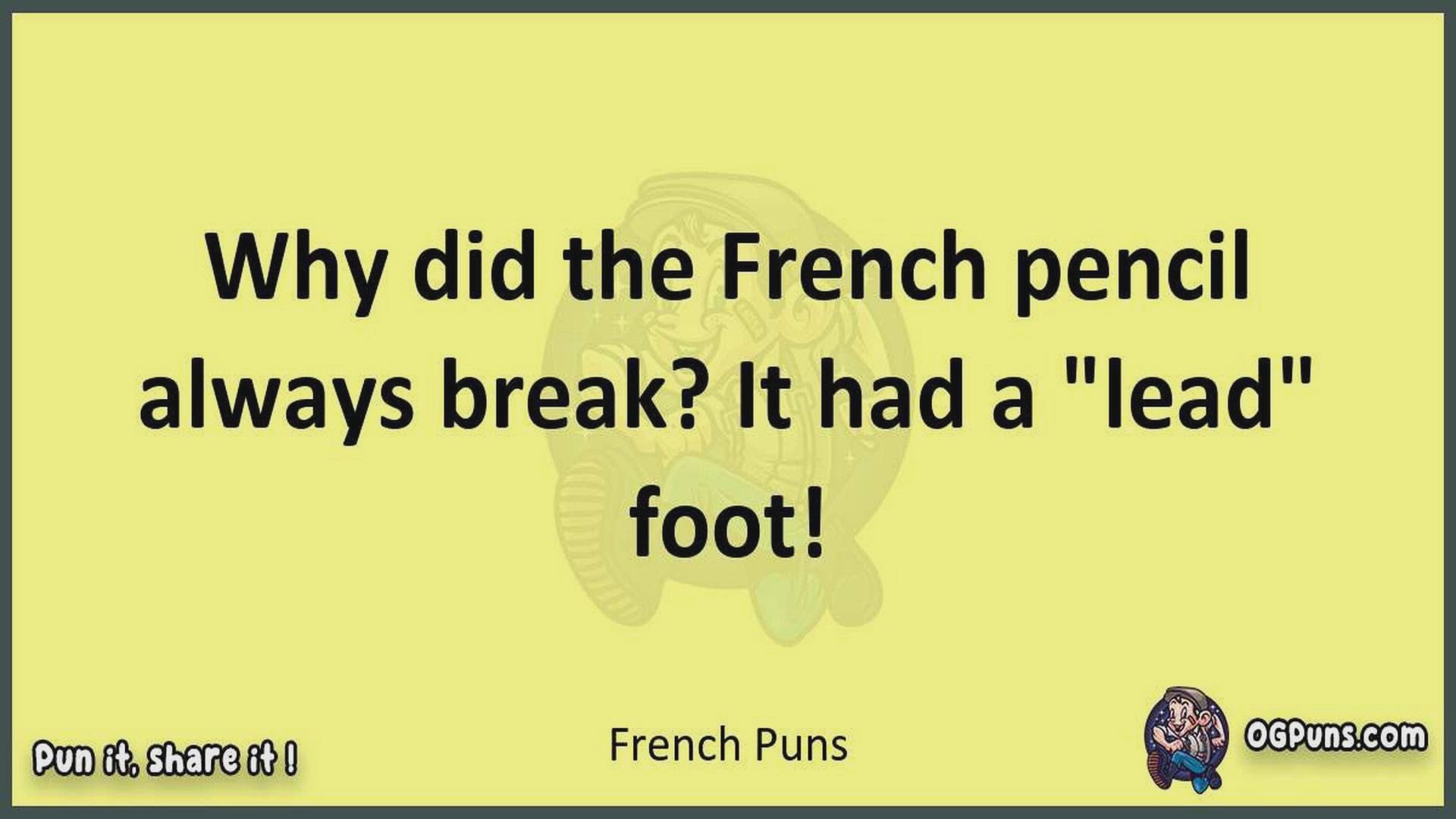 Delve into the delightful world of French Puns ! Here, you'll find an entertaining mix of jokes, puns, quips, and wordplay. Each piece is crafted to offer a quick escape into humor, perfect for a light-hearted moment in any day. Whether you're seeking a chuckle or a clever twist on familiar themes, this collection promises to deliver smiles and laughter. Embrace the lighter side of life with humor that's both witty and refreshing."