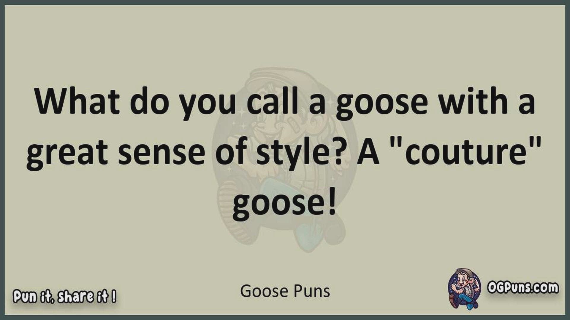 Delve into the delightful world of Goose Puns ! Here, you'll find an entertaining mix of jokes, puns, quips, and wordplay. Each piece is crafted to offer a quick escape into humor, perfect for a light-hearted moment in any day. Whether you're seeking a chuckle or a clever twist on familiar themes, this collection promises to deliver smiles and laughter. Embrace the lighter side of life with humor that's both witty and refreshing."