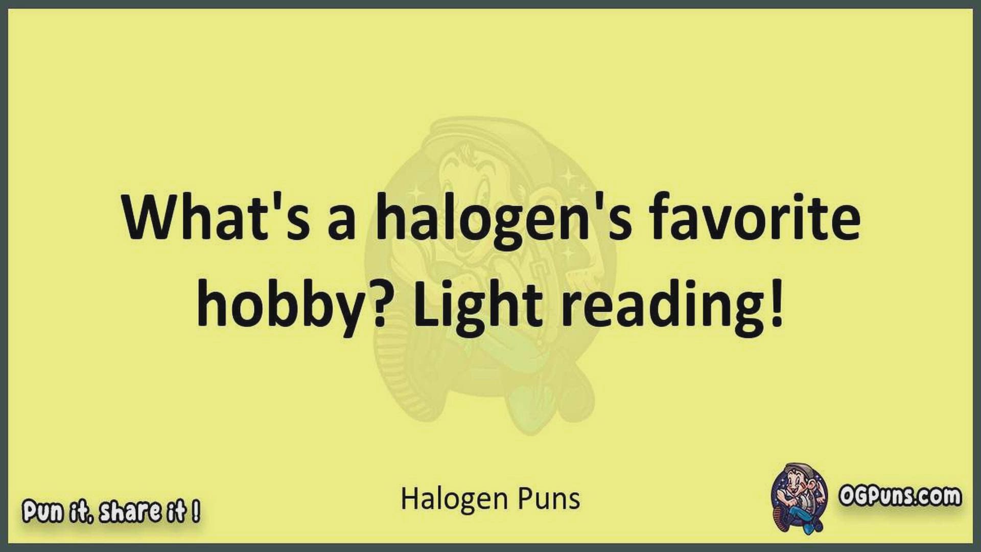 Delve into the delightful world of Halogen Puns ! Here, you'll find an entertaining mix of jokes, puns, quips, and wordplay. Each piece is crafted to offer a quick escape into humor, perfect for a light-hearted moment in any day. Whether you're seeking a chuckle or a clever twist on familiar themes, this collection promises to deliver smiles and laughter. Embrace the lighter side of life with humor that's both witty and refreshing."