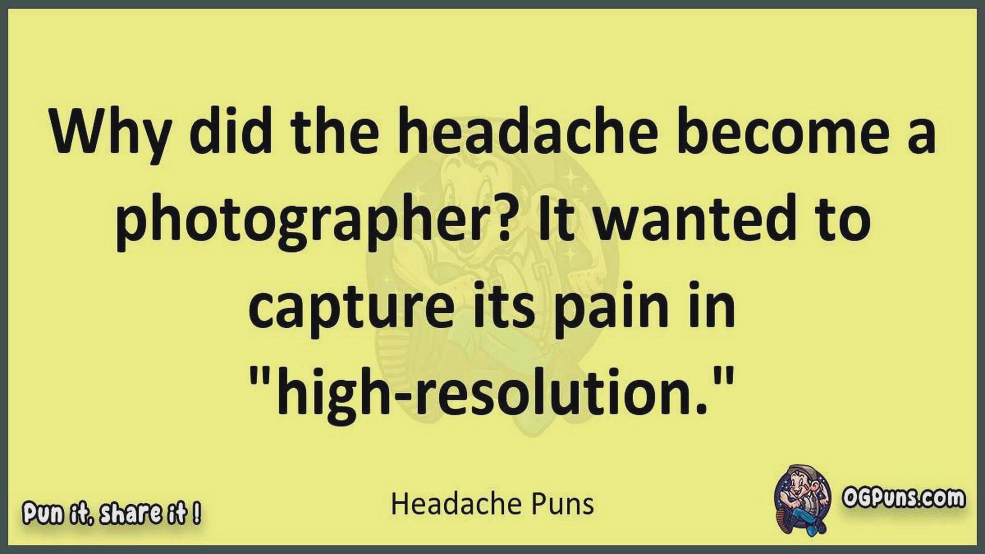 Delve into the delightful world of Headache Puns ! Here, you'll find an entertaining mix of jokes, puns, quips, and wordplay. Each piece is crafted to offer a quick escape into humor, perfect for a light-hearted moment in any day. Whether you're seeking a chuckle or a clever twist on familiar themes, this collection promises to deliver smiles and laughter. Embrace the lighter side of life with humor that's both witty and refreshing."