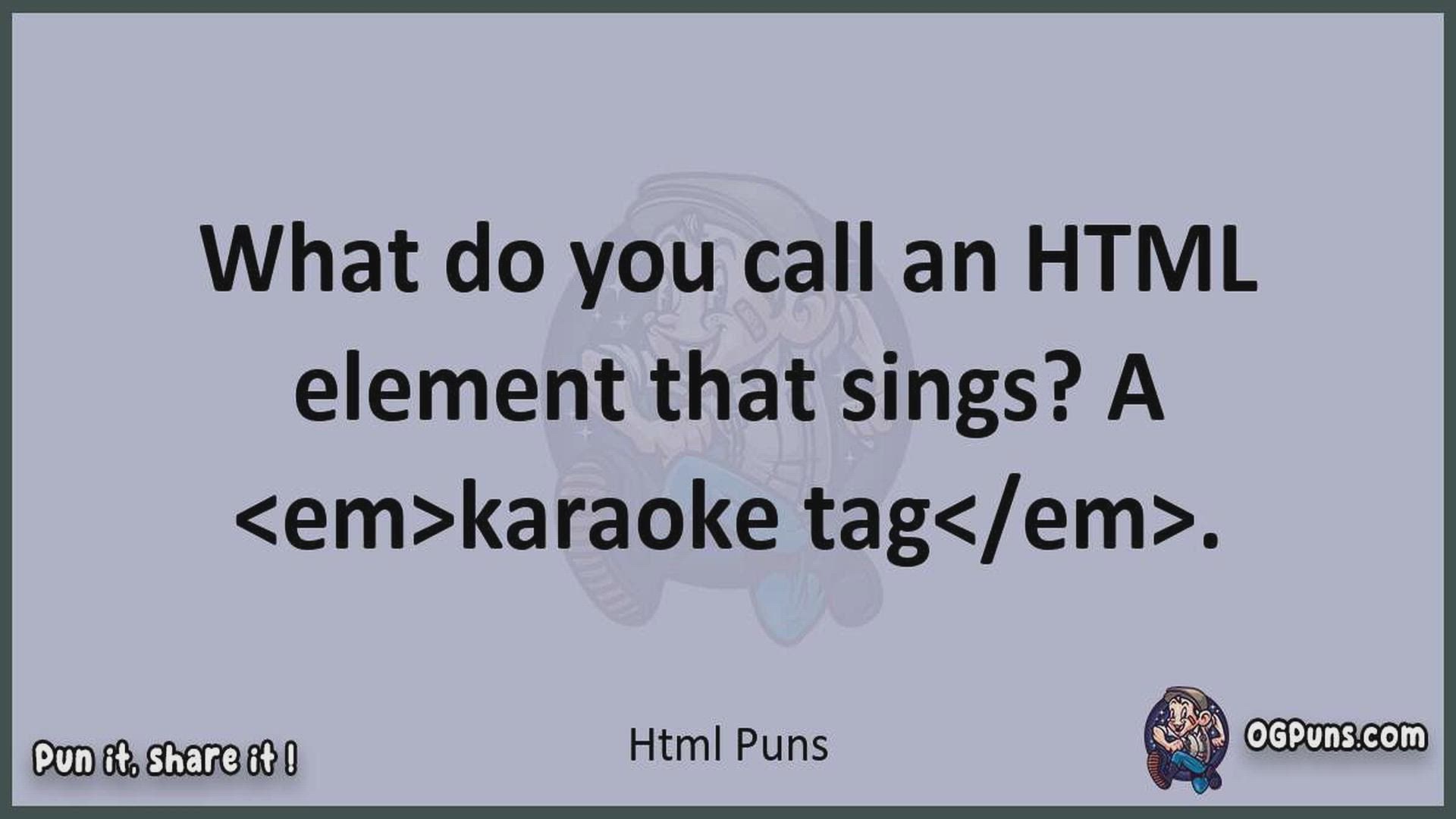 Delve into the delightful world of Html Puns ! Here, you'll find an entertaining mix of jokes, puns, quips, and wordplay. Each piece is crafted to offer a quick escape into humor, perfect for a light-hearted moment in any day. Whether you're seeking a chuckle or a clever twist on familiar themes, this collection promises to deliver smiles and laughter. Embrace the lighter side of life with humor that's both witty and refreshing."