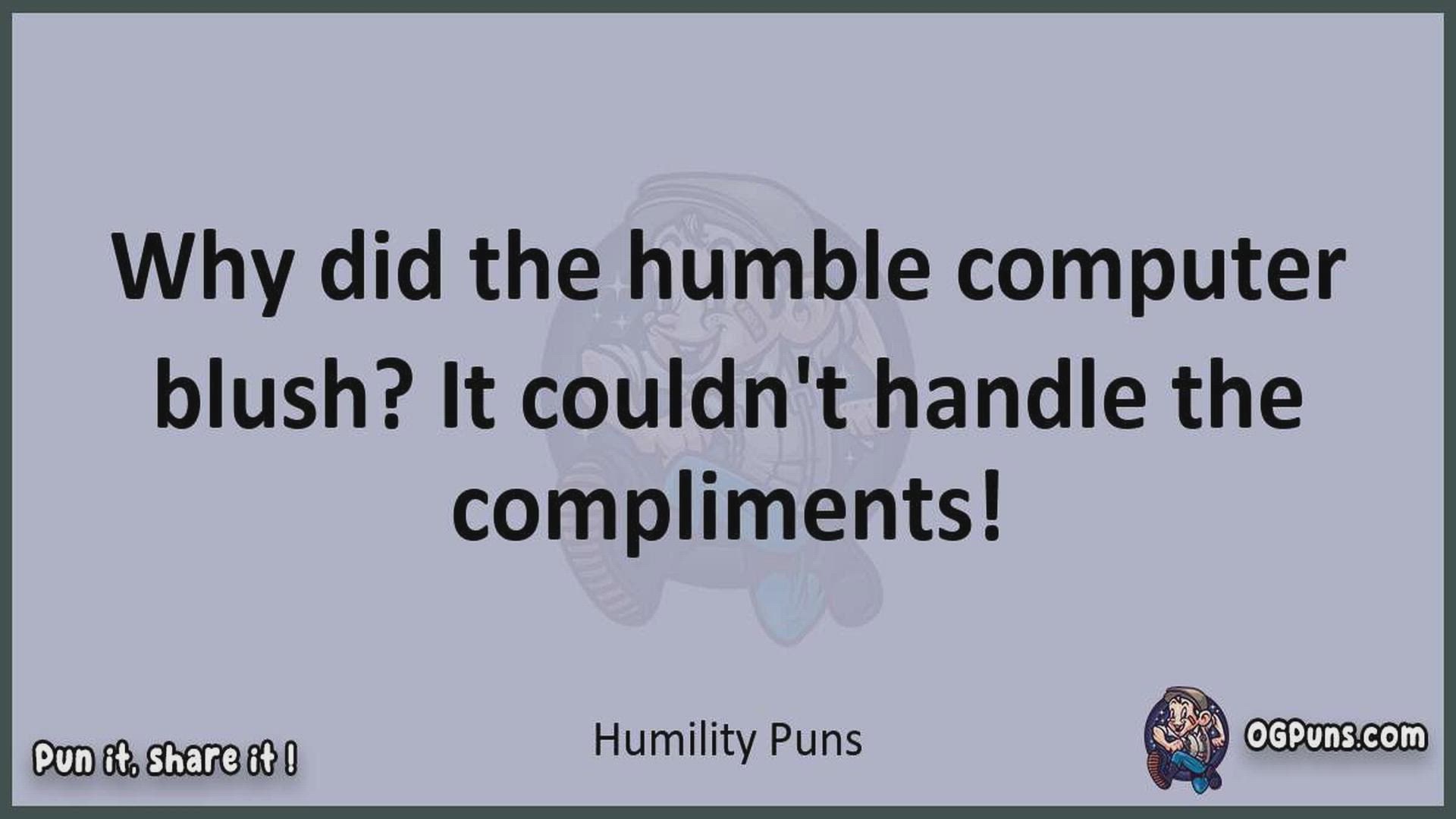 Delve into the delightful world of Humility Puns ! Here, you'll find an entertaining mix of jokes, puns, quips, and wordplay. Each piece is crafted to offer a quick escape into humor, perfect for a light-hearted moment in any day. Whether you're seeking a chuckle or a clever twist on familiar themes, this collection promises to deliver smiles and laughter. Embrace the lighter side of life with humor that's both witty and refreshing."