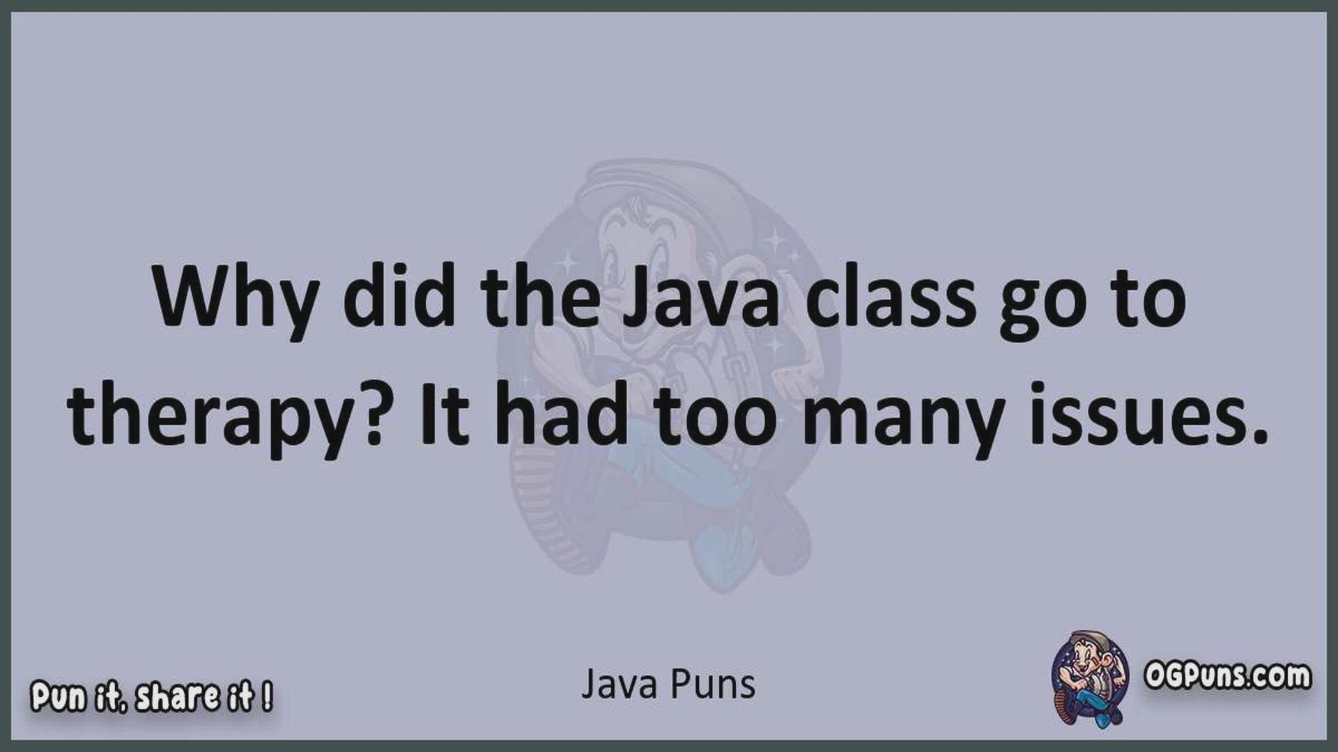 Delve into the delightful world of Java Puns ! Here, you'll find an entertaining mix of jokes, puns, quips, and wordplay. Each piece is crafted to offer a quick escape into humor, perfect for a light-hearted moment in any day. Whether you're seeking a chuckle or a clever twist on familiar themes, this collection promises to deliver smiles and laughter. Embrace the lighter side of life with humor that's both witty and refreshing."