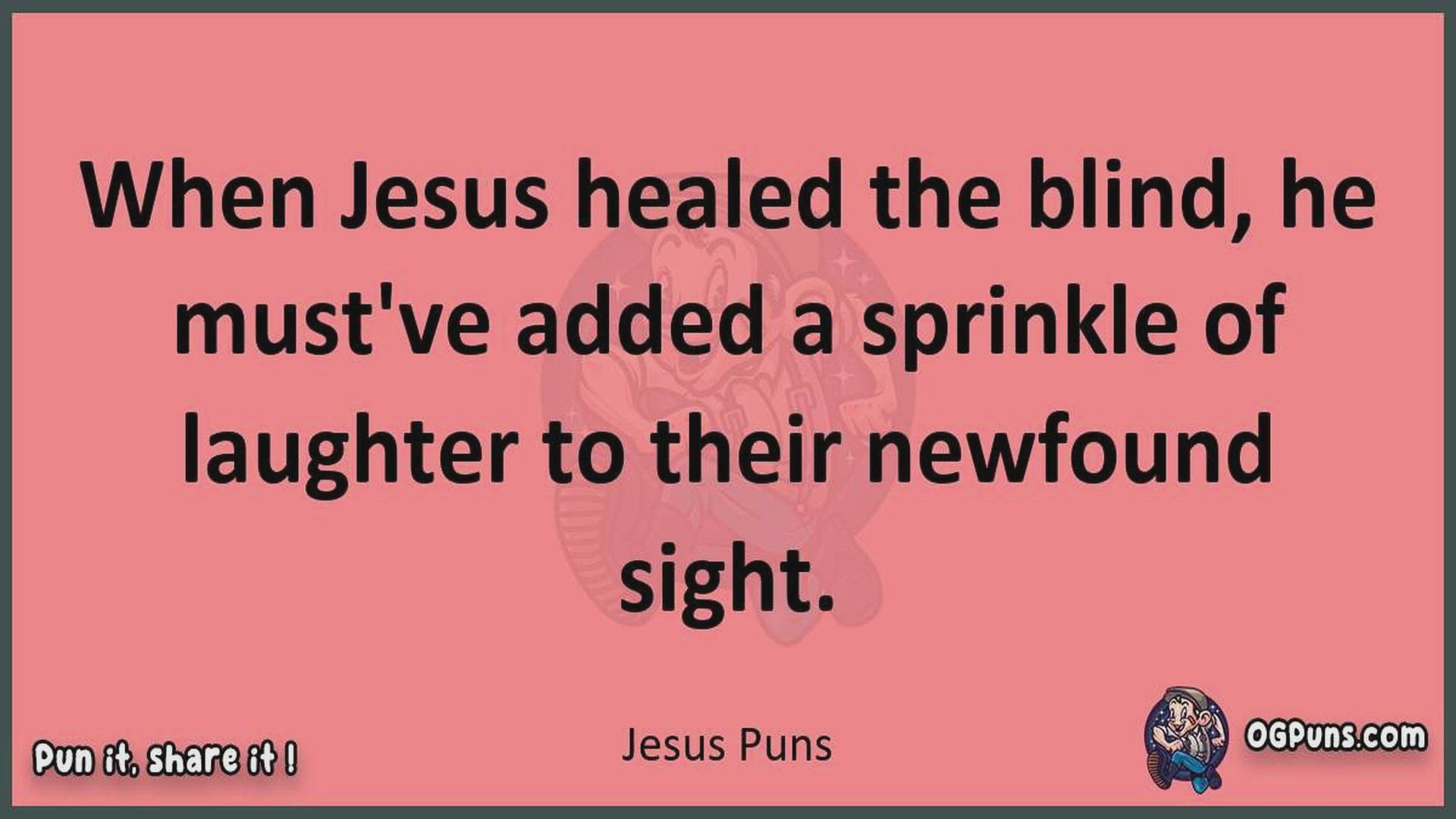 Delve into the delightful world of Jesus Puns ! Here, you'll find an entertaining mix of jokes, puns, quips, and wordplay. Each piece is crafted to offer a quick escape into humor, perfect for a light-hearted moment in any day. Whether you're seeking a chuckle or a clever twist on familiar themes, this collection promises to deliver smiles and laughter. Embrace the lighter side of life with humor that's both witty and refreshing."