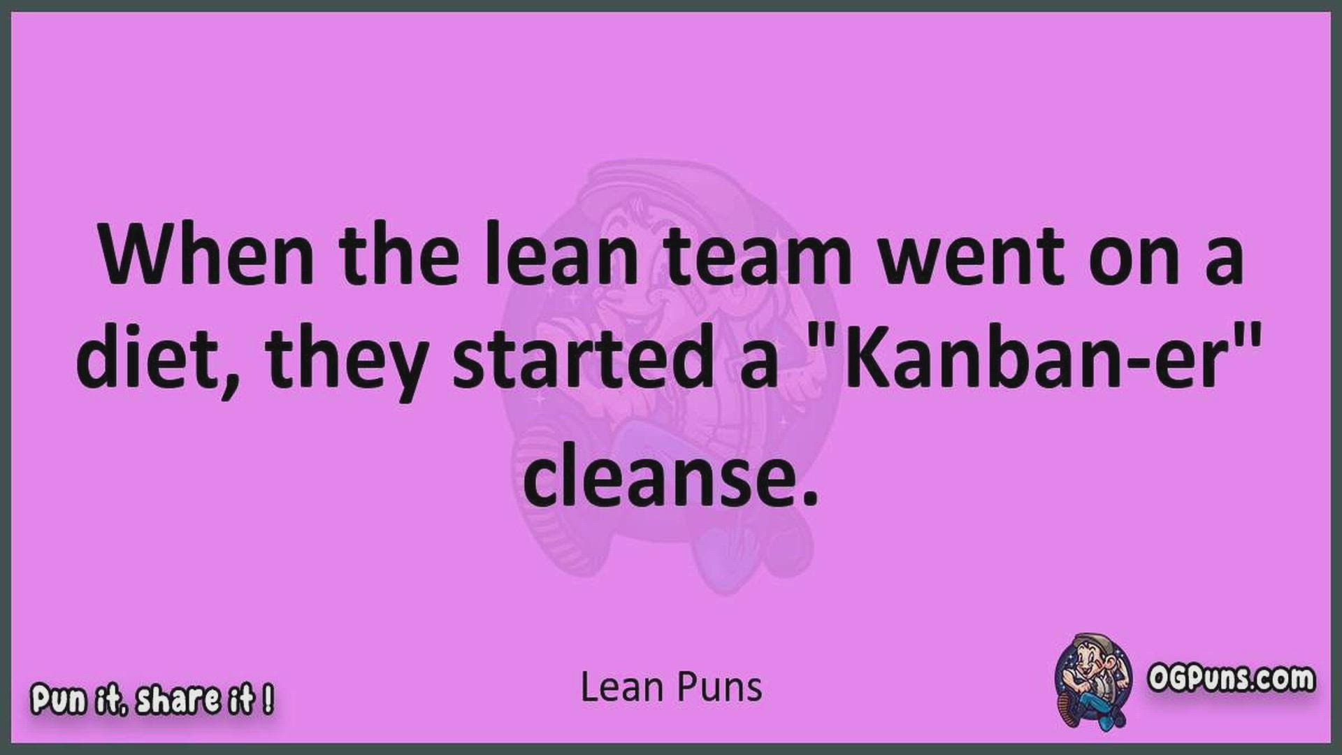 Delve into the delightful world of Lean Puns ! Here, you'll find an entertaining mix of jokes, puns, quips, and wordplay. Each piece is crafted to offer a quick escape into humor, perfect for a light-hearted moment in any day. Whether you're seeking a chuckle or a clever twist on familiar themes, this collection promises to deliver smiles and laughter. Embrace the lighter side of life with humor that's both witty and refreshing."