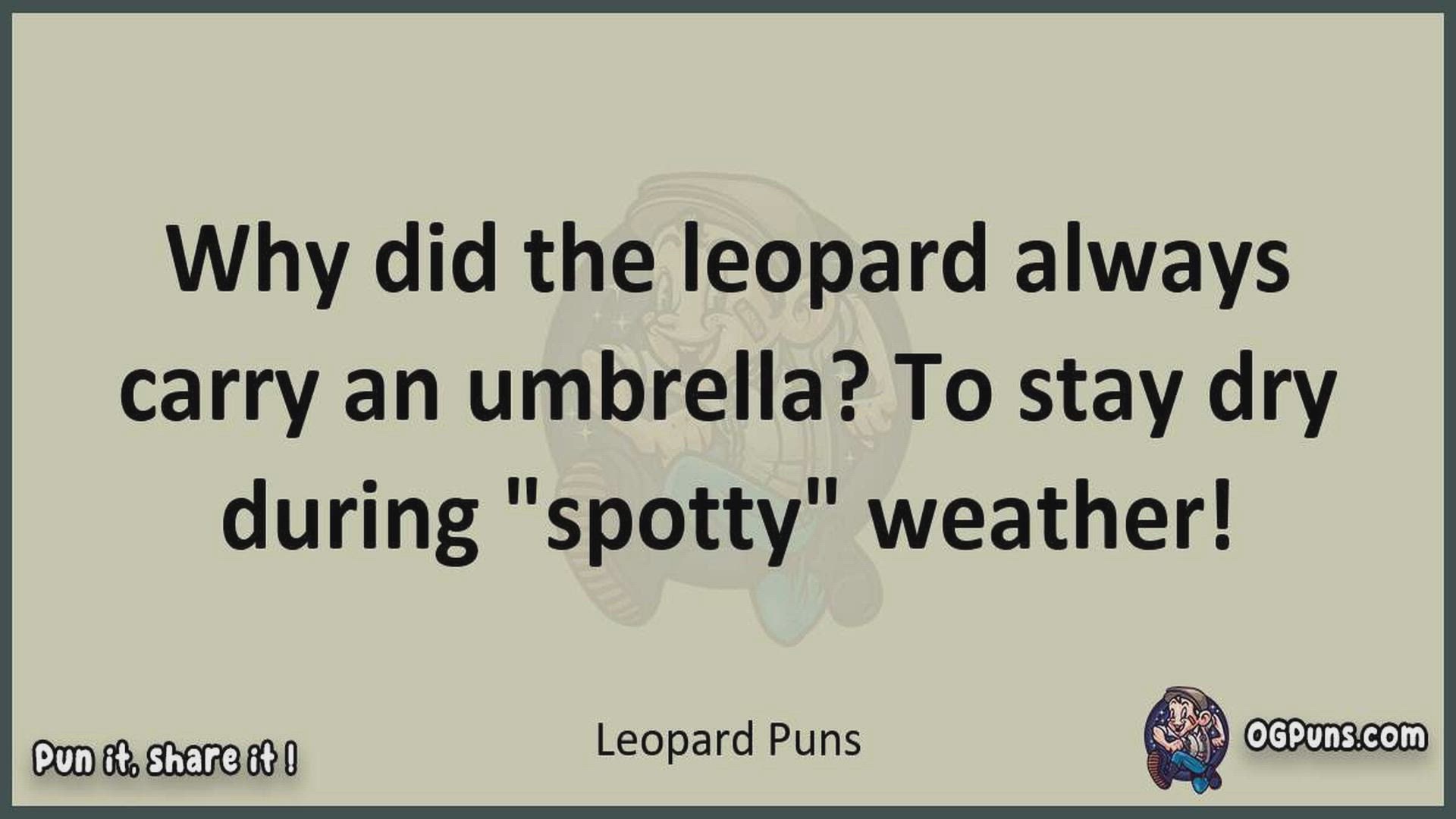 Delve into the delightful world of Leopard Puns ! Here, you'll find an entertaining mix of jokes, puns, quips, and wordplay. Each piece is crafted to offer a quick escape into humor, perfect for a light-hearted moment in any day. Whether you're seeking a chuckle or a clever twist on familiar themes, this collection promises to deliver smiles and laughter. Embrace the lighter side of life with humor that's both witty and refreshing."