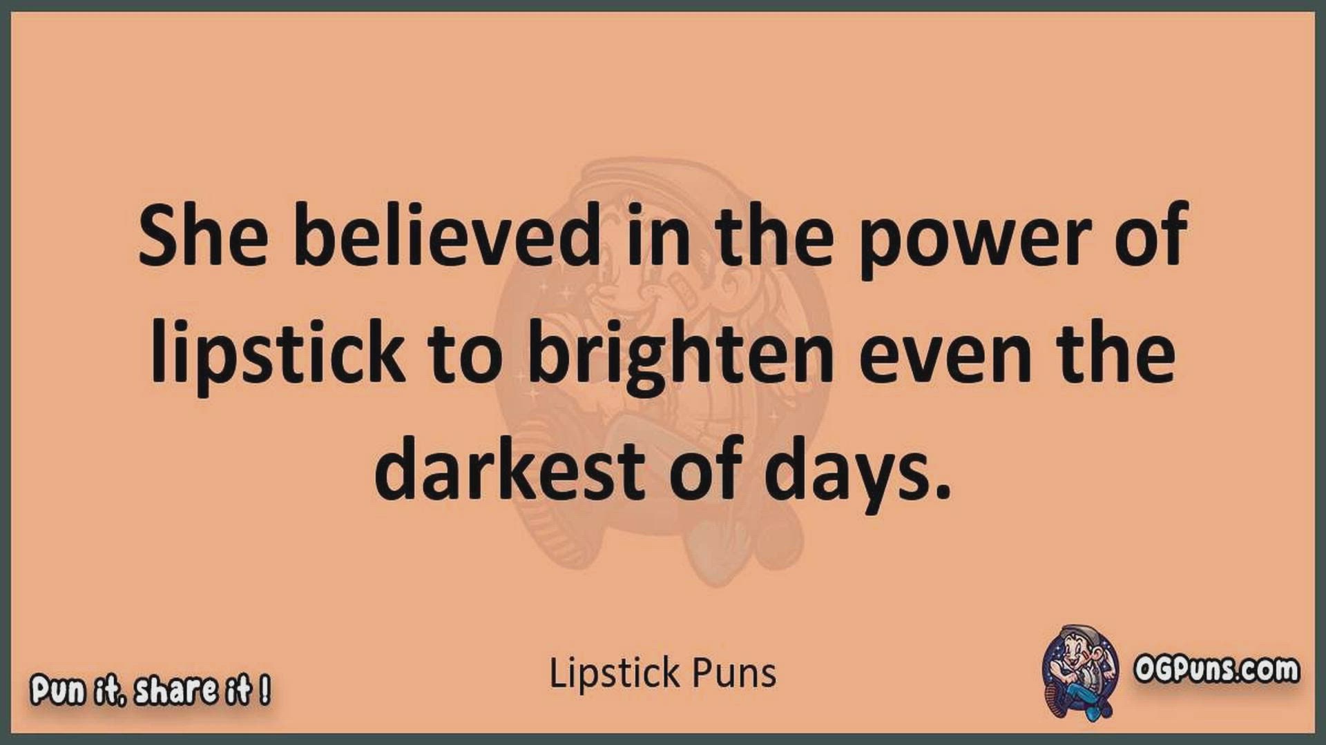 Delve into the delightful world of Lipstick Puns ! Here, you'll find an entertaining mix of jokes, puns, quips, and wordplay. Each piece is crafted to offer a quick escape into humor, perfect for a light-hearted moment in any day. Whether you're seeking a chuckle or a clever twist on familiar themes, this collection promises to deliver smiles and laughter. Embrace the lighter side of life with humor that's both witty and refreshing."
