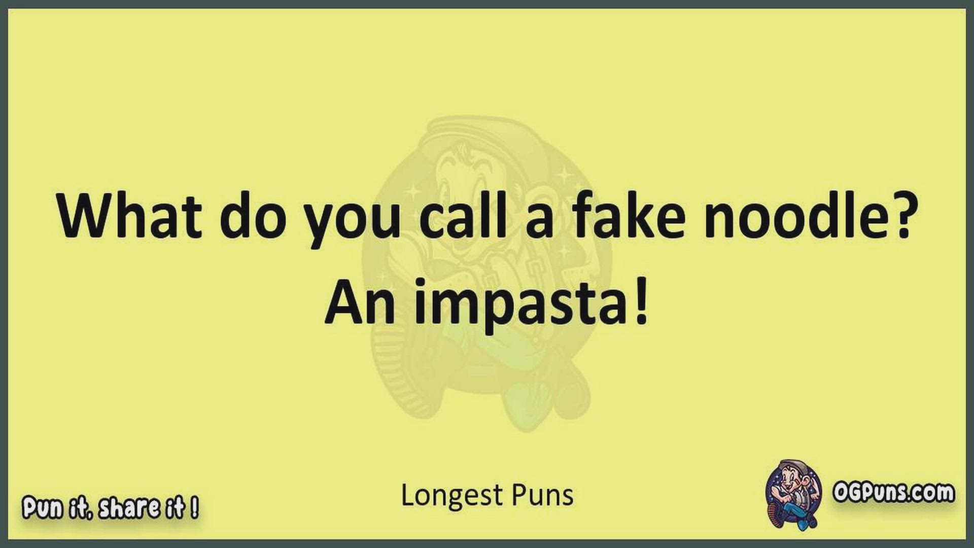 Delve into the delightful world of Longest Puns ! Here, you'll find an entertaining mix of jokes, puns, quips, and wordplay. Each piece is crafted to offer a quick escape into humor, perfect for a light-hearted moment in any day. Whether you're seeking a chuckle or a clever twist on familiar themes, this collection promises to deliver smiles and laughter. Embrace the lighter side of life with humor that's both witty and refreshing."