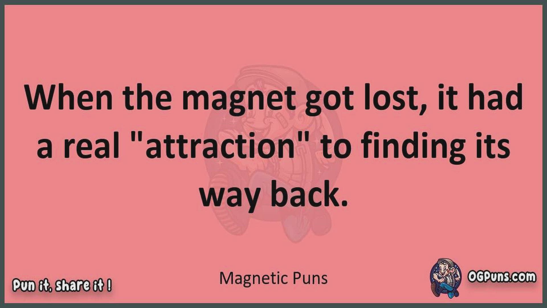 Delve into the delightful world of Magnetic Puns ! Here, you'll find an entertaining mix of jokes, puns, quips, and wordplay. Each piece is crafted to offer a quick escape into humor, perfect for a light-hearted moment in any day. Whether you're seeking a chuckle or a clever twist on familiar themes, this collection promises to deliver smiles and laughter. Embrace the lighter side of life with humor that's both witty and refreshing."